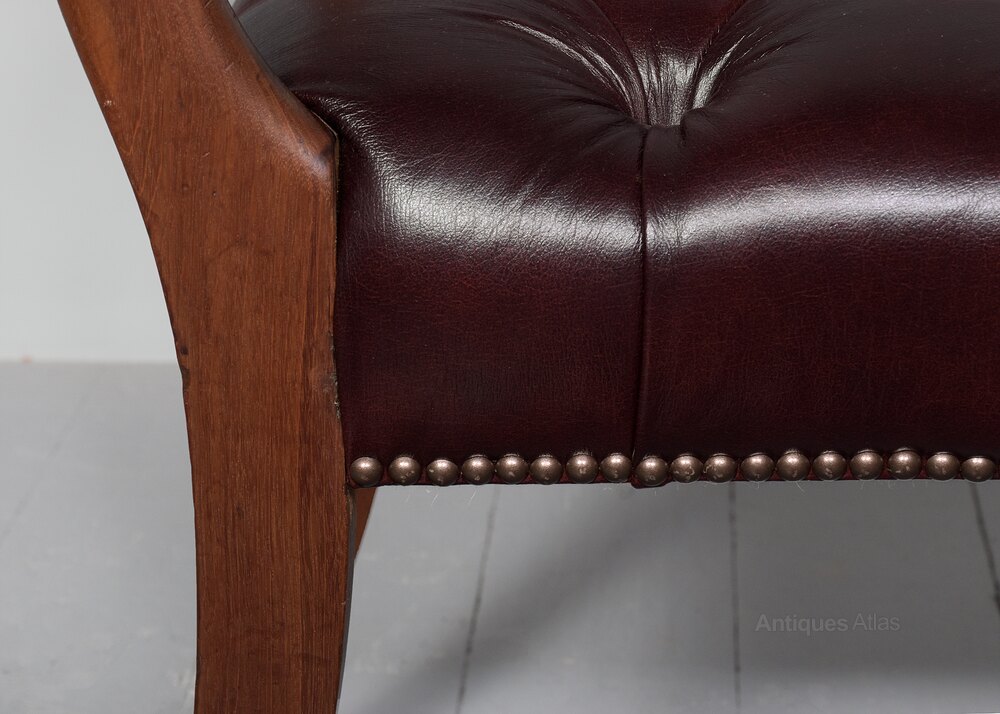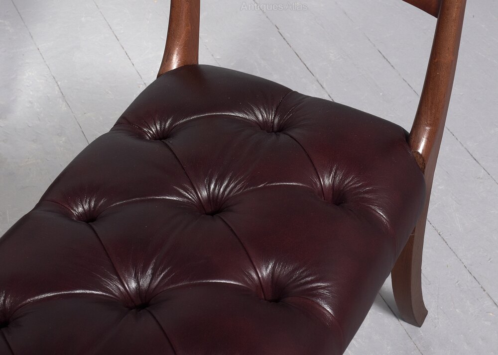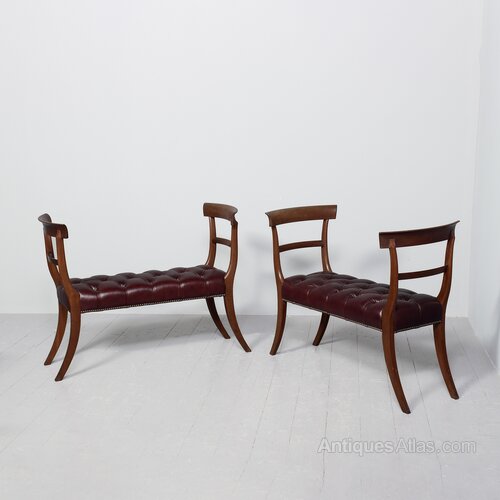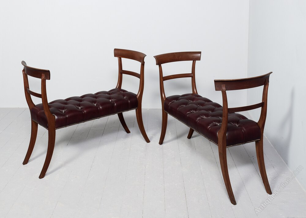 Circa 1840 with alterations. William 4th mahogany window seats with moulded and arched top rails at each side above smaller central rails. The deeply buttoned seats in burgundy hide with brass studding and supported on tapering, splayed supports.