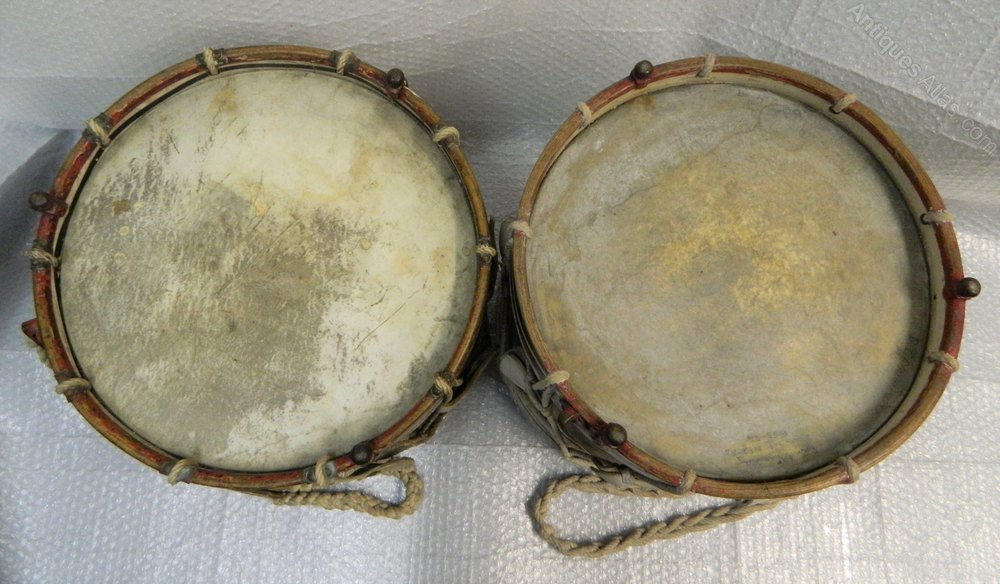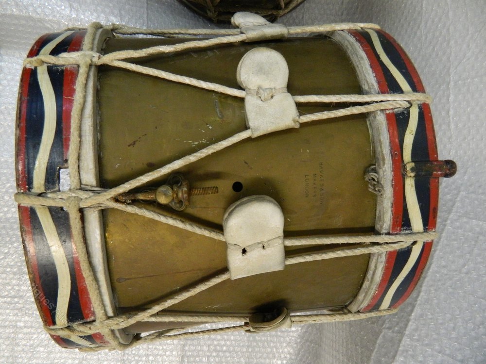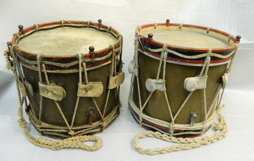 Obviously because they have been used, the drums have wear and tear, scuffs and dents etc, but really, these drums are two great items of militaria , they have pencilled names of drummers who have used them over the years and really need to be seen to be fully appreciated... they would make a fantastic pair of side antique tables or bedside antique tables.