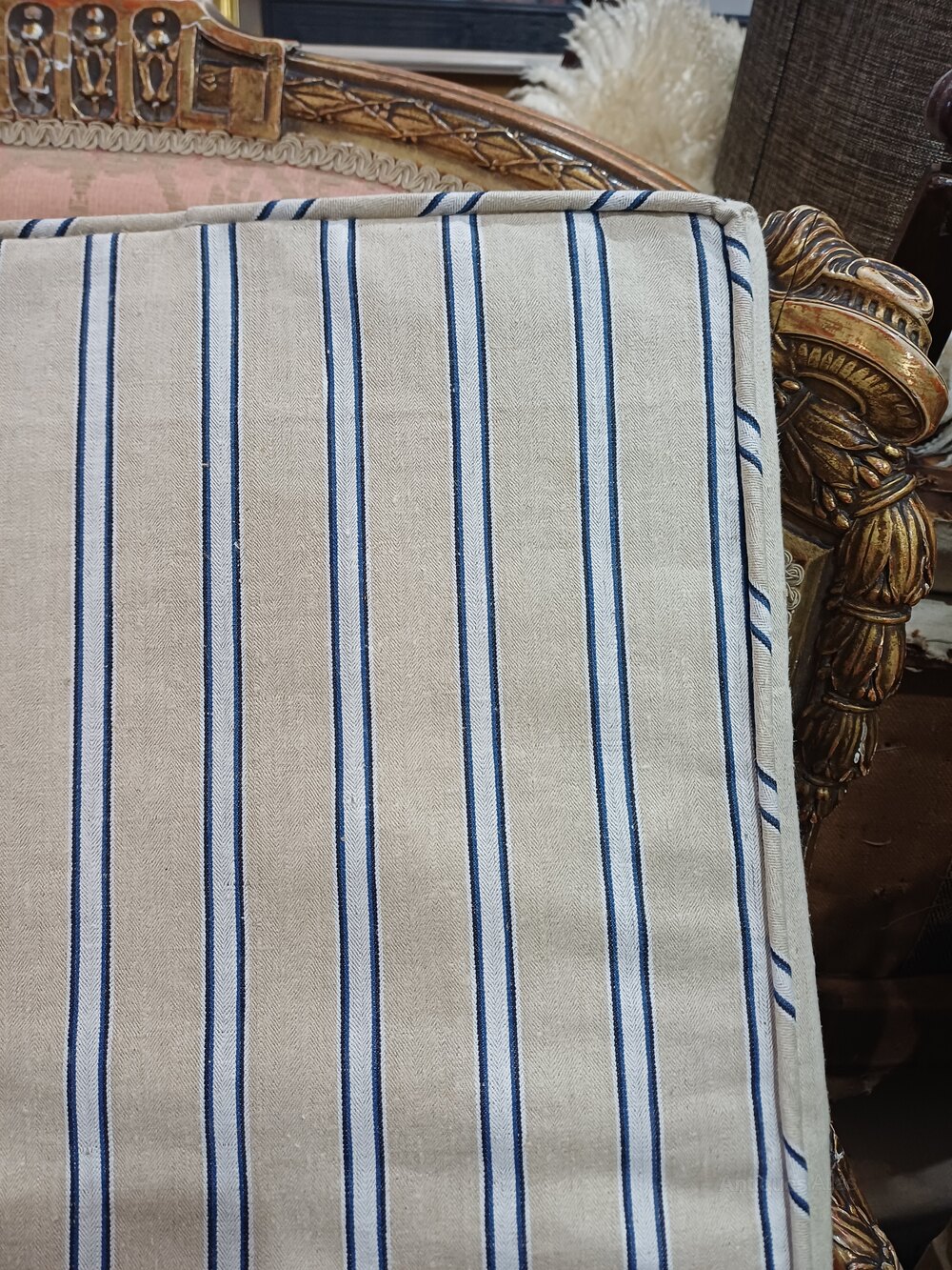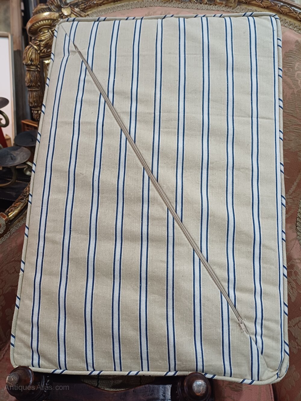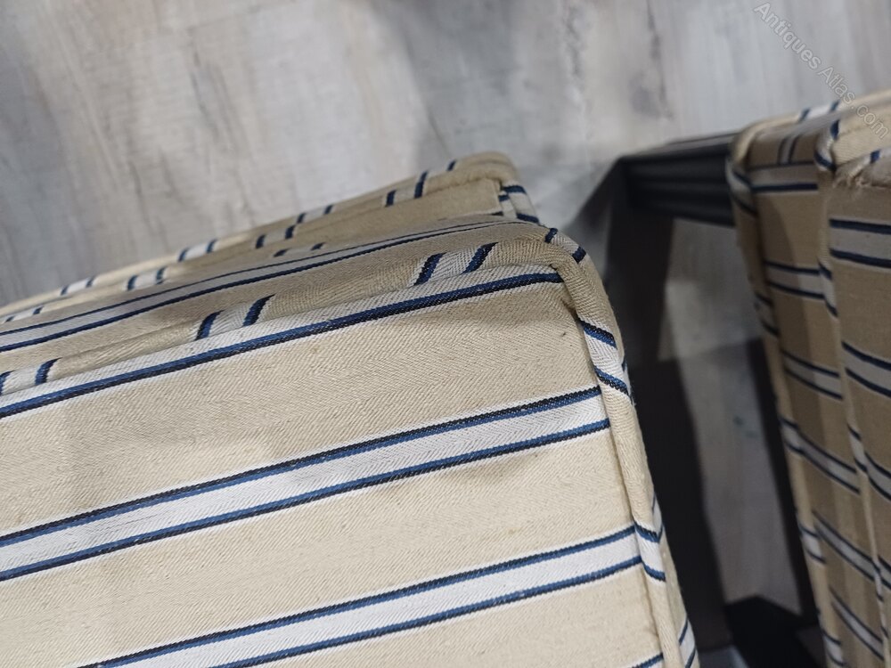 Matched pair of stools upholstered in vintage Edwardian linen/canvas stripe fabric fully zipped for removal to clean Smart pair of stools