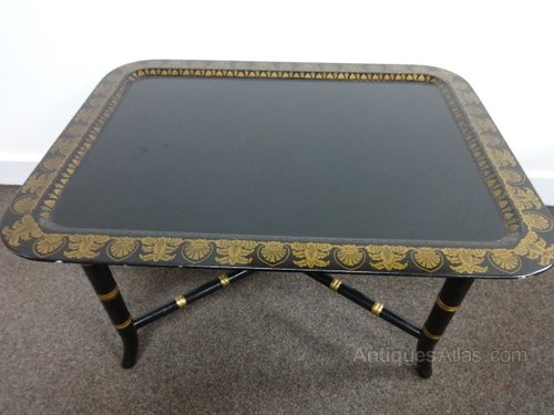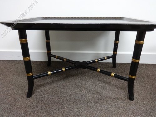 A good pair of Regency style sofa antique tables, coffee tables, faux bamboo and gilded legs, tray tops with gilt decoration in very good original condition.
