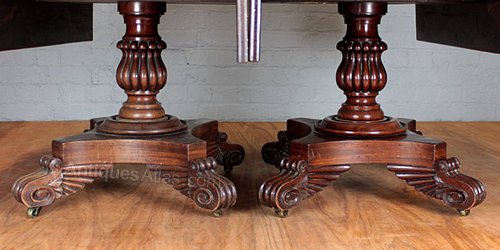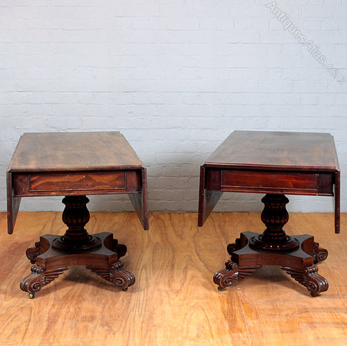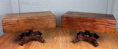 A stunning pair of Regency mahogany Pembroke antique tables c.1820. Of exceptional quality with solid mahogany tops of the kind of timber only available to the cabinet maker’s of this period. With an oak lined drawer to each and raised on turned and fluted pedestals, carved feet of unusual design and original brass castors. The edge of one leaf on each is either notched or recessed allowing the two tables to fit together to make a splendid twin pedestal dining table. A rare pair of tables in original and unrestored condition.