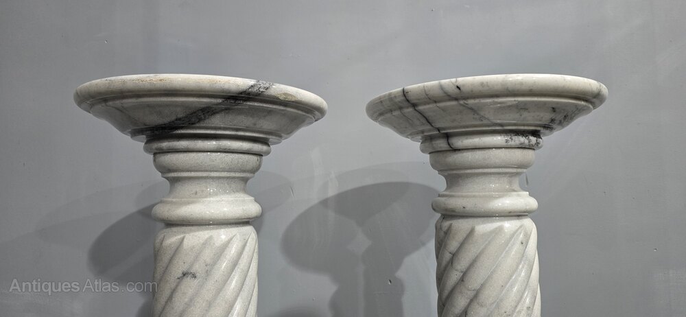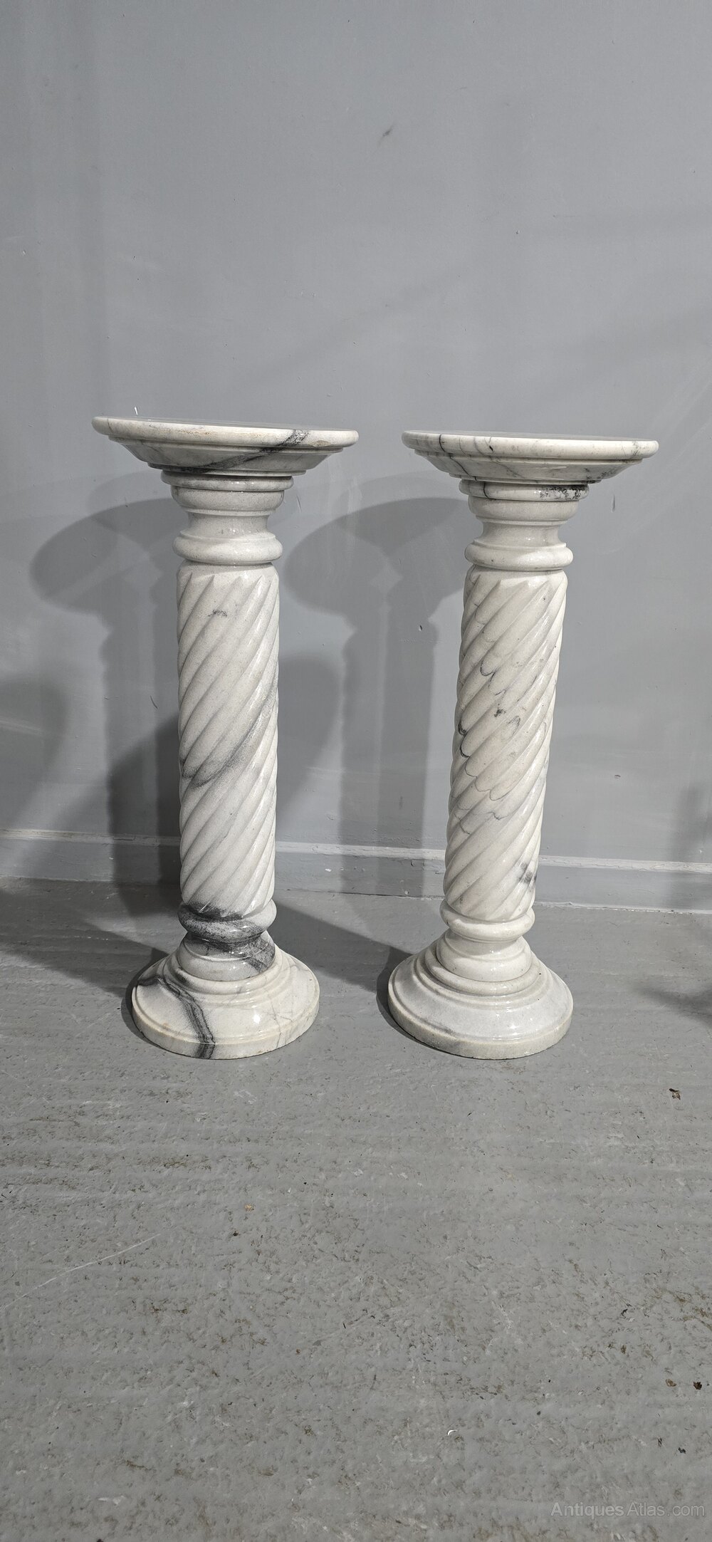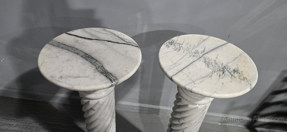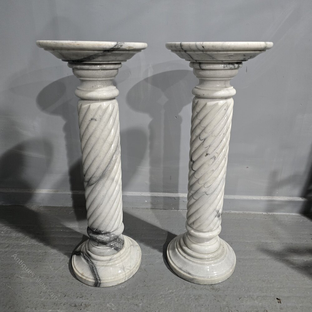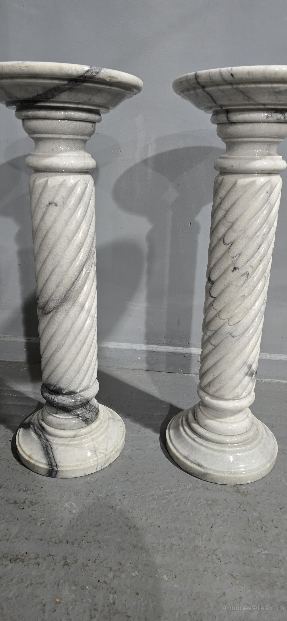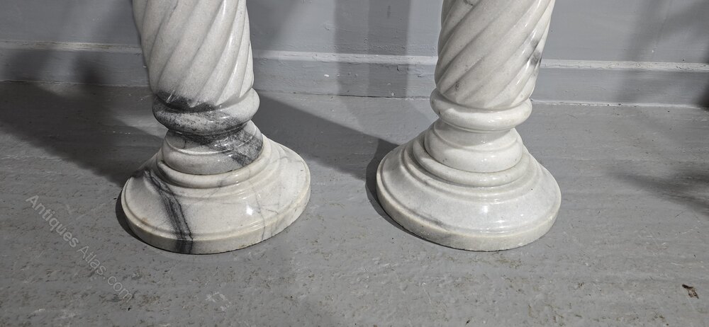 A very good pair of twisted column variegated marble pedestals, in very good overall condition.