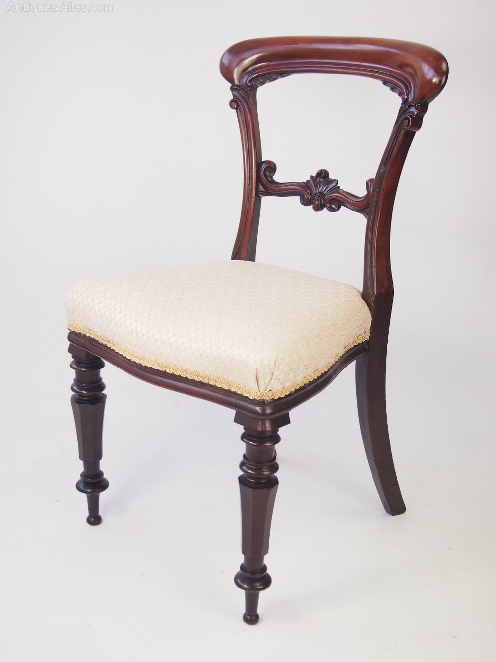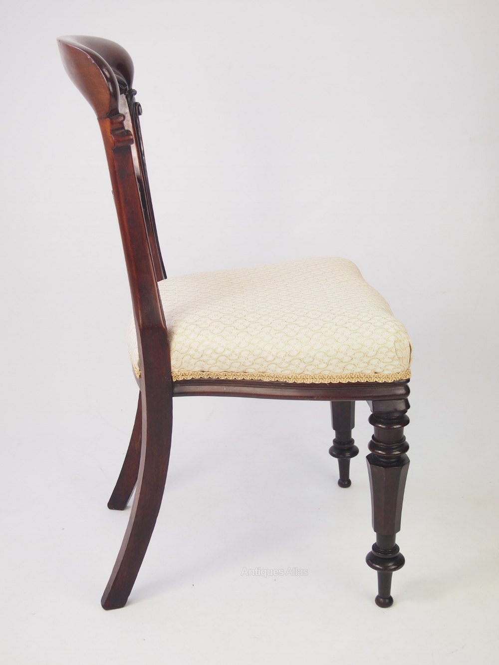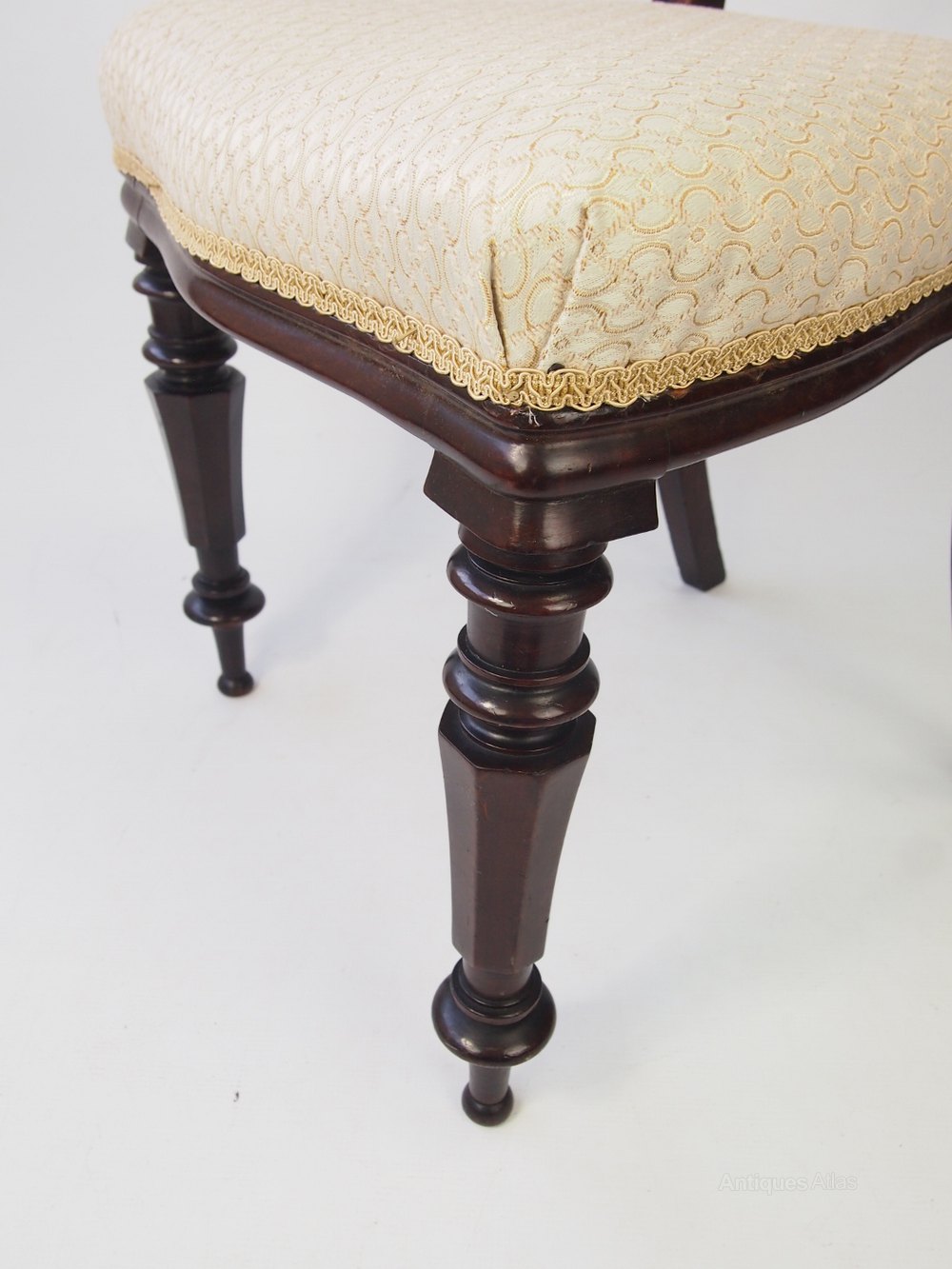 An elegant pair of antique Victorian mahogany side chairs. With carved bar backs and turned legs they have stuffover seats which have been newly recovered in a gold brocade fabric over the existing upholstery which is in fair condition. Solid and sturdy and in good condition in mahogany with a polished finish.