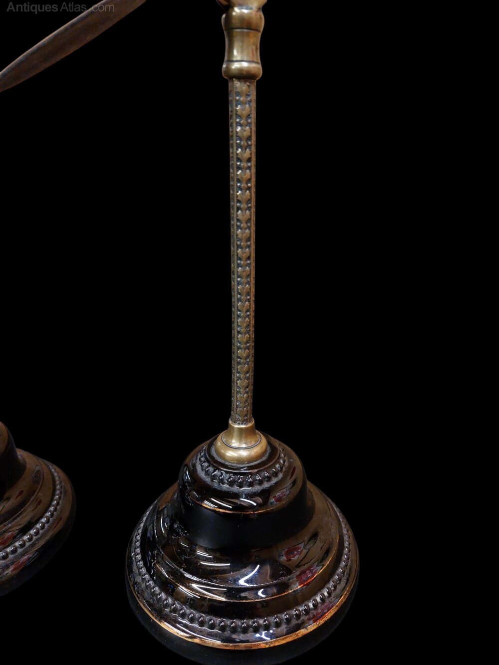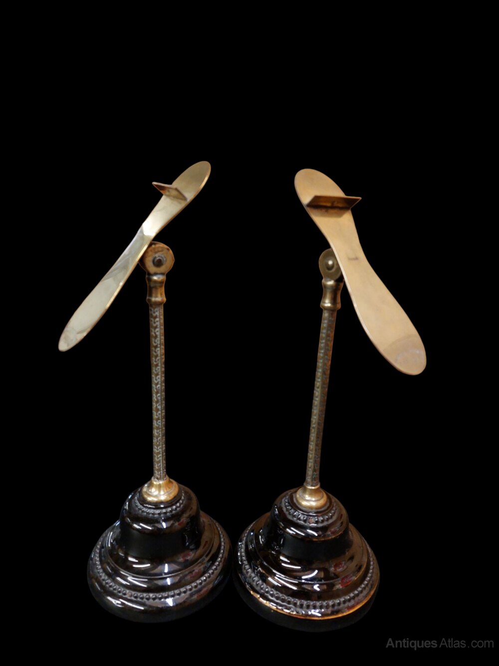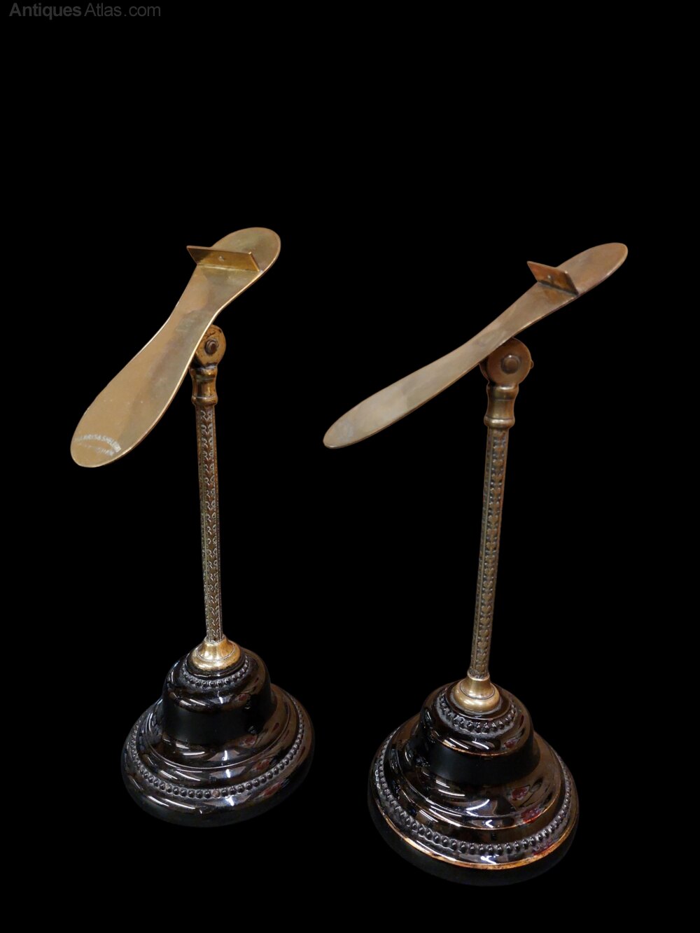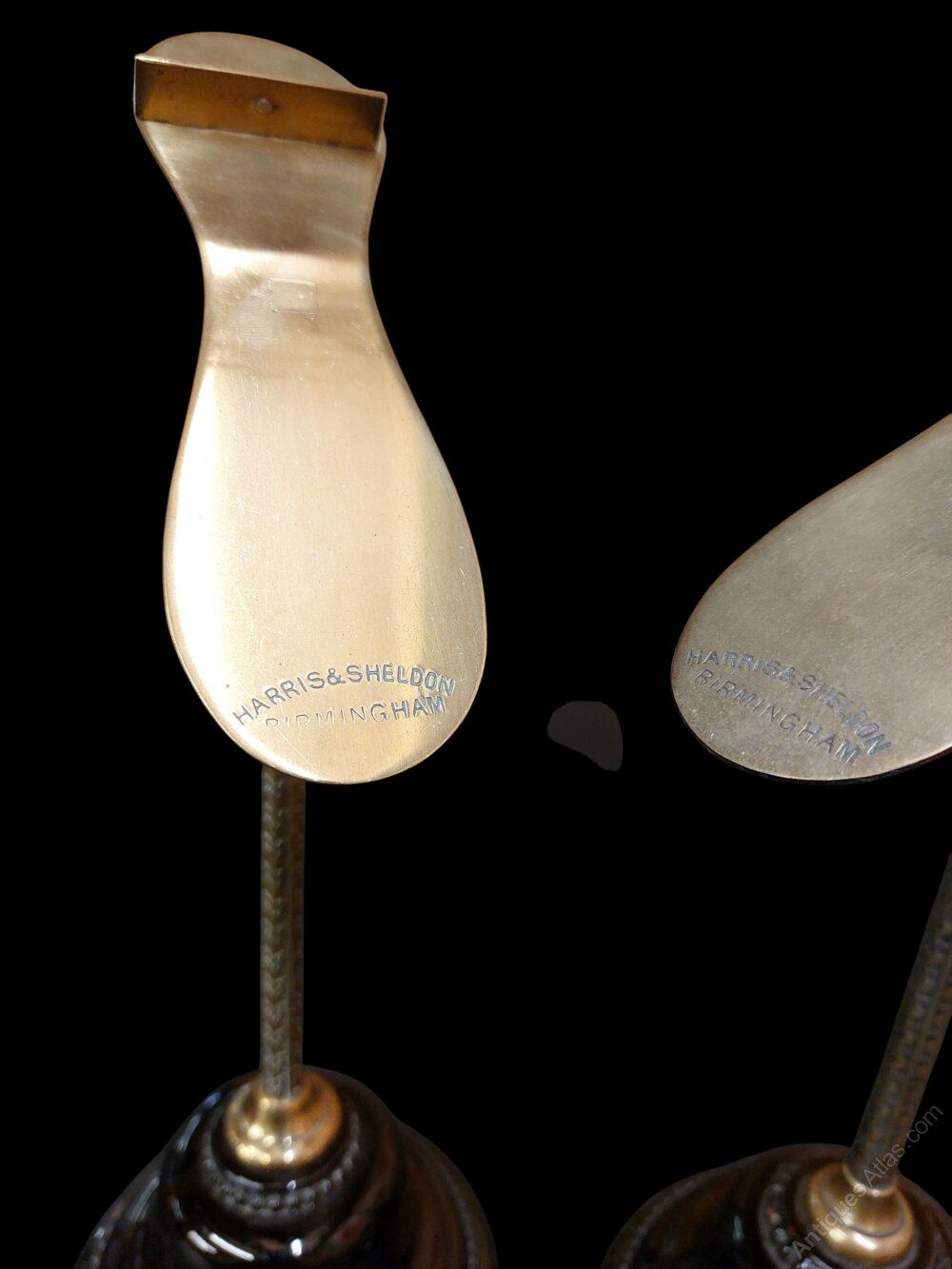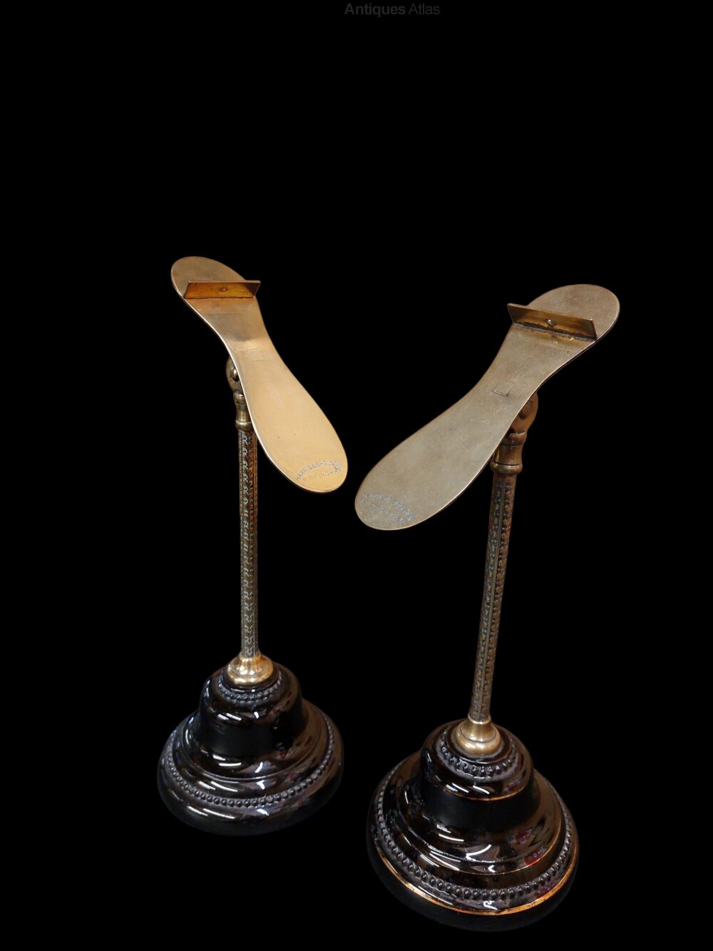A fabulous pair of Harris and Sheldon of Birmingham shoe display stands. Rare to find in pairs. Stamped to the brass rests and underneath the black glazed terracotta bases with Harris and Sheldon. Beautifully engraved brass columns with 4 way adjustable shoe rests. Very good condition. Circa 1900. Display your favourite shoes in your dressing room with these fine items.
