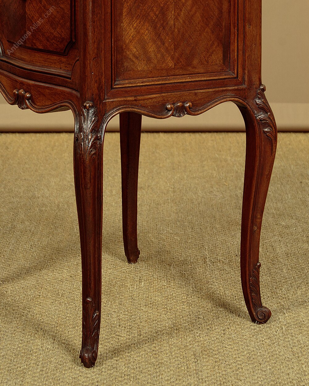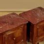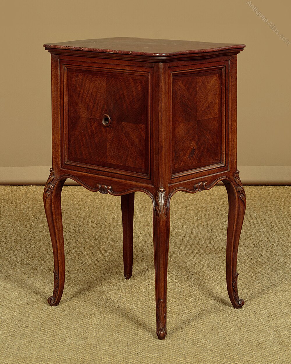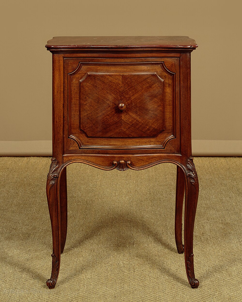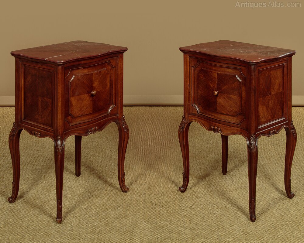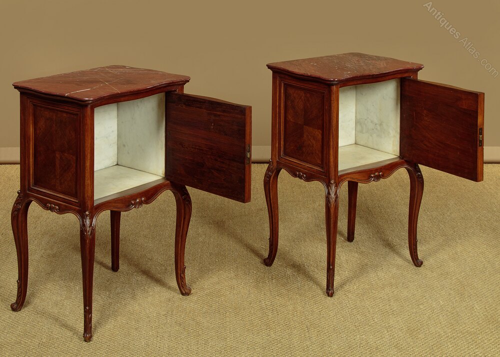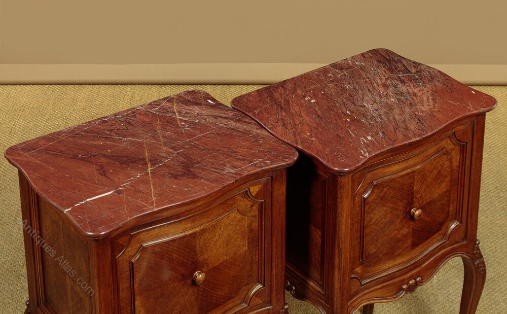 Pair of late 19th.c. French walnut and marble top bedside cabinets c.1880. Original rouge griotte marble tops with serpentine edges. Over left hand opening cupboards with the original marble lined interiors (depth 9"). Serpentine fronts with walnut quarter veneered panels, repeated as flat panels on the cabinet sides and rear. Shaped and moulded apron all round and raised on cabriole legs, all with carved acanthus detail to the knees and feet. Some minor wear to the marble, otherwise excellent colour and condition, cleaned and waxed in our workshops.