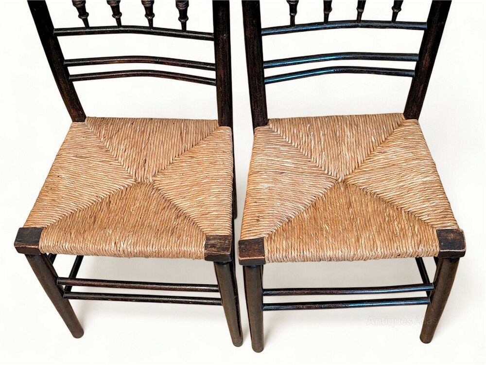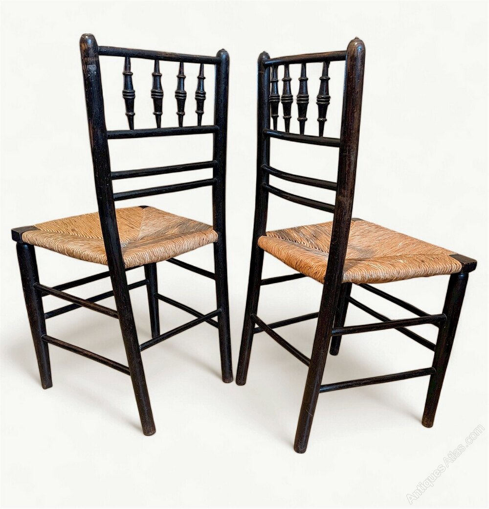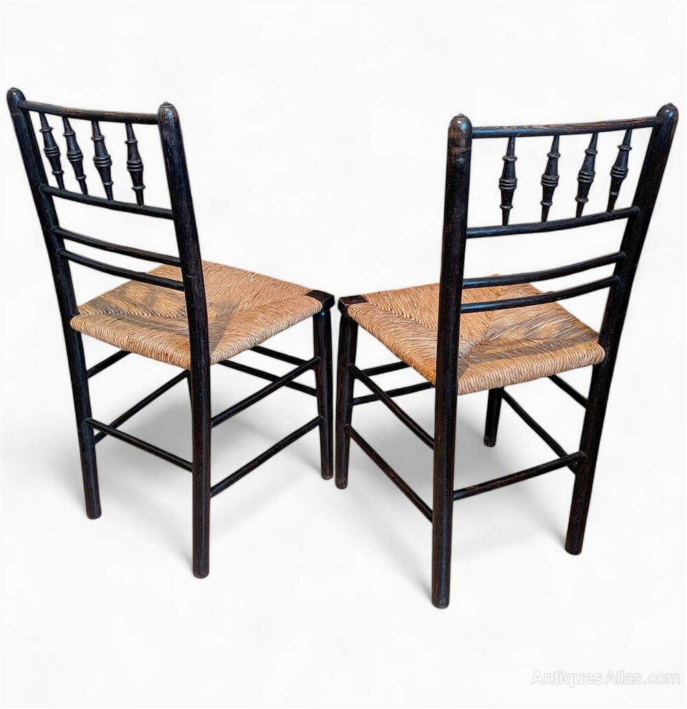 Pair of William Morris ebonised chairs in ash , illustrated in the Morris & Co catalogue of Sussex chairs . Very good original condition with no overpainting , showing wear in the right places and probably re rushed within the last 30 years . Priced for the pair .
