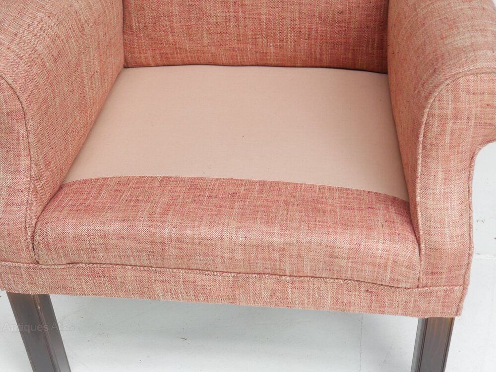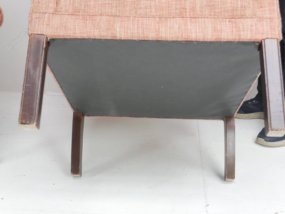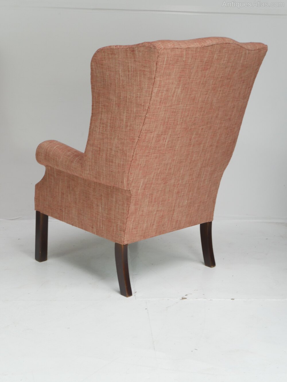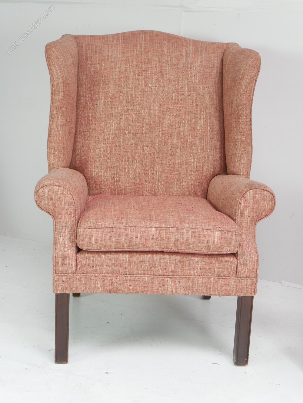 A good quality pair of wing armchairs, loose cushions, mahogany legs, well upholstered in a lovely dusky textured fabric. Both in good condition, a very comfortable seat, seating height 50cm, all ready for use. A few extra photos available.