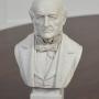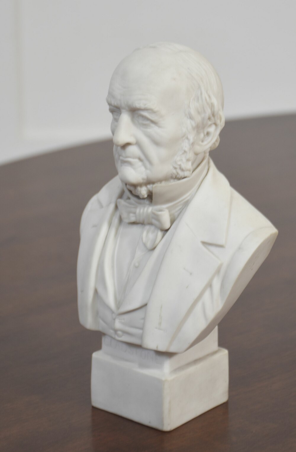 A finely modelled Parian bust depicting William Ewart Gladstone, shown in later life with a high forehead, deeply set eyes, and pronounced sideburns. The sitter is portrayed wearing a formal Victorian jacket, waistcoat, and bow tie, with crisp detailing to the costume and sensitive modelling of the facial features. The bust is raised on an integral square Parian socle, the front inscribed “GLADSTONE.”