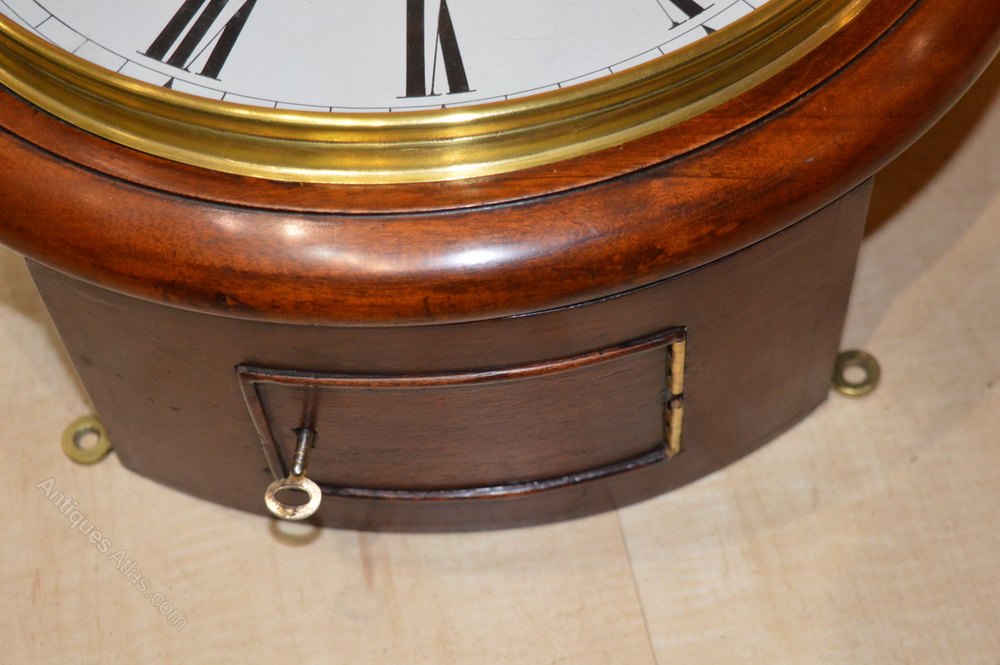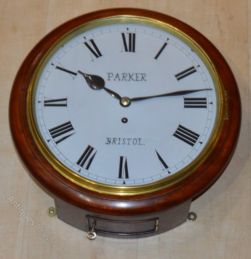 An English fusee dial wall antique clock. A 12" painted dial signed ' Parker Bristol' with blued steel hands. A mahogany case with a brass bezel surround. An 8-day duration timepiece fusee mechanism. Circa 1880.