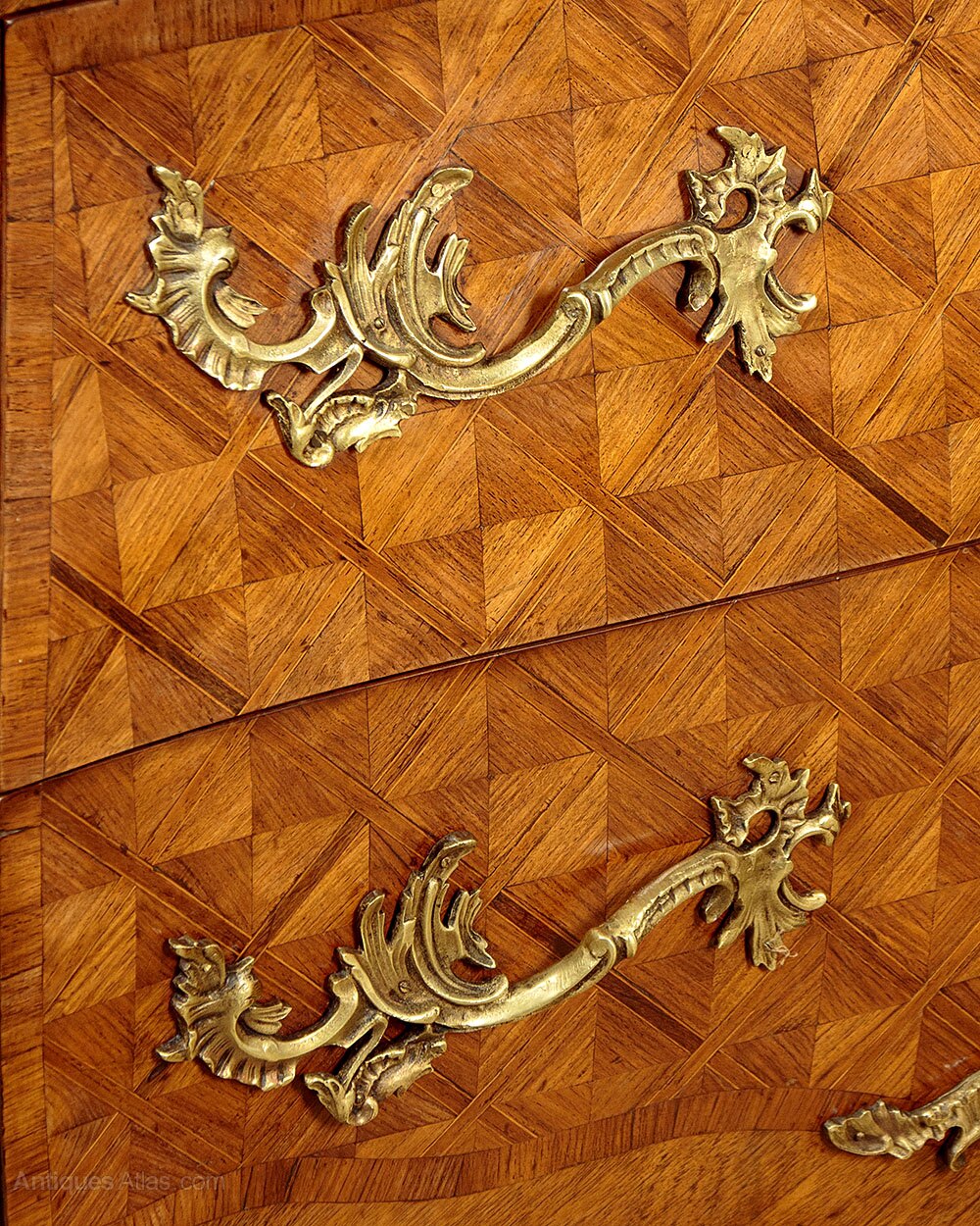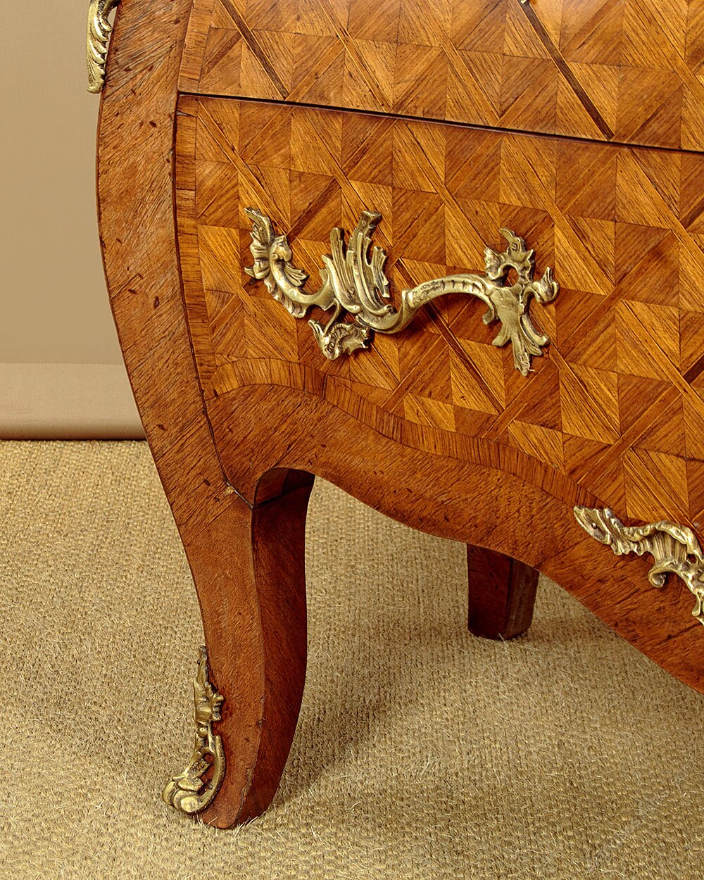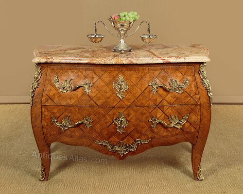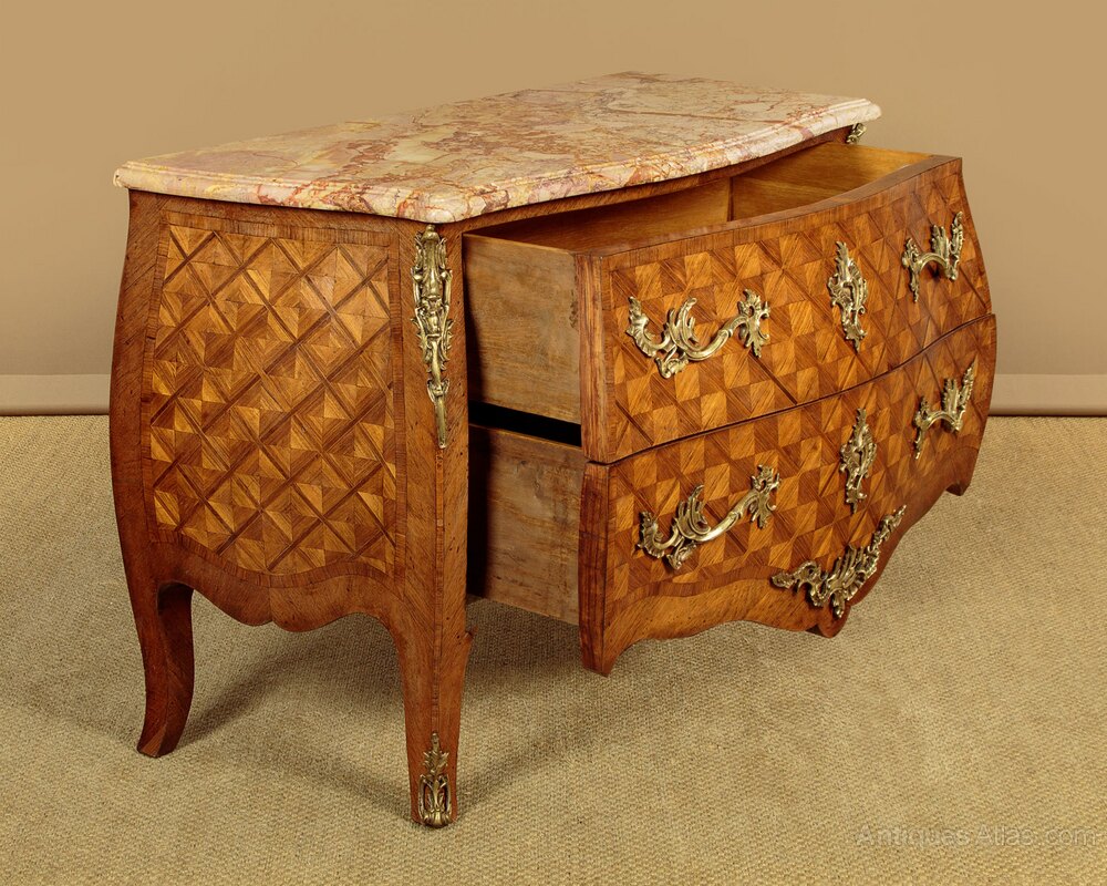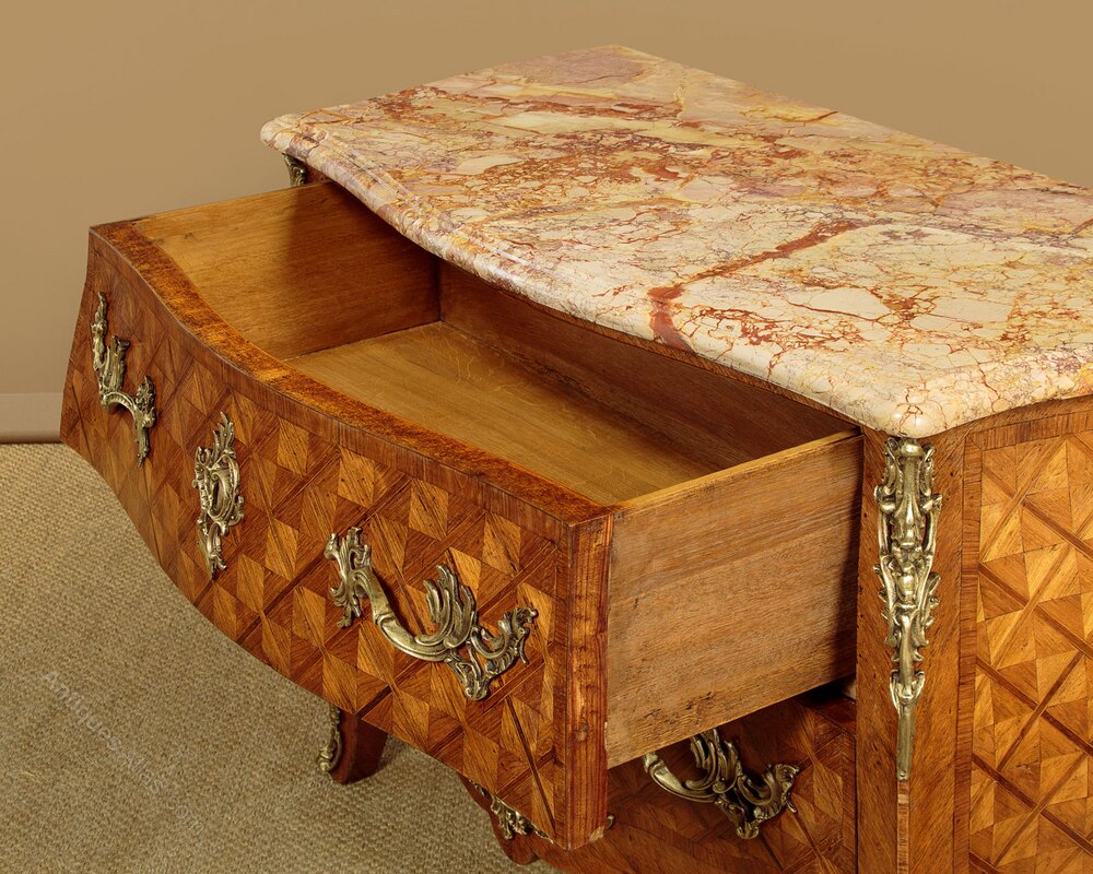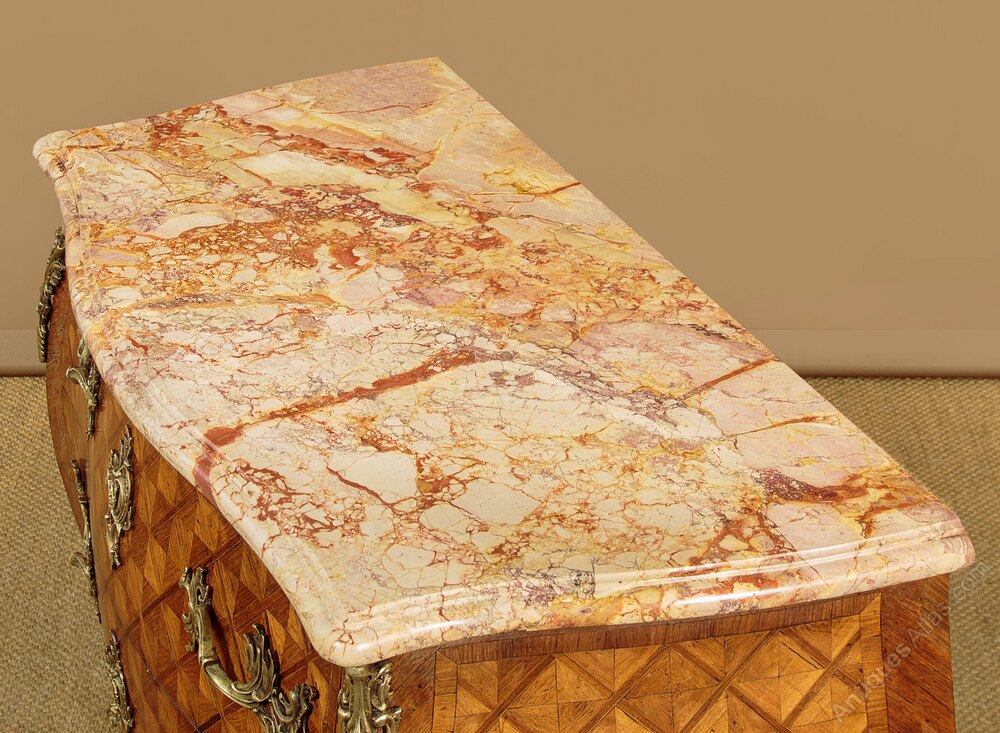 Good sized French Louis XV style marble top parquetry commode or chest of drawers c.1930. Beautifully figured 1¼" tick marble top with a serpentine shaped and moulded edge. Over a chest of two large drawers with bombe shaped front and sides featuring superb parquetry work veneers laid to create a striking geometric pattern within a crossbanded surround. Large and well cast pierced brass handles and escutcheon plates to the drawer fronts, pierced brass mounts to the shoulders and at the centre of the apron to the bottom edge of the lower drawer front. Shaped legs with further brass mounts to the front feet. Oak drawer linings. Excellent colour and condition, cleaned and waxed in our workshops.