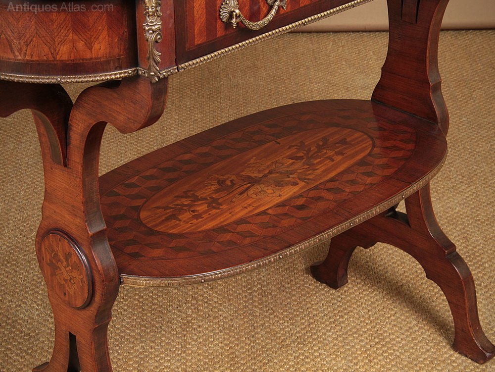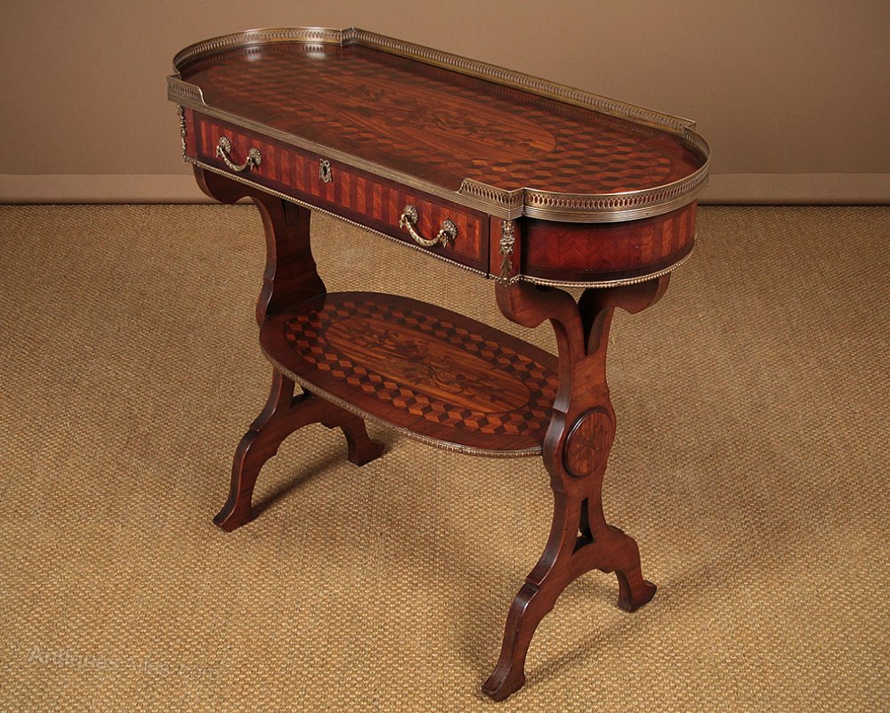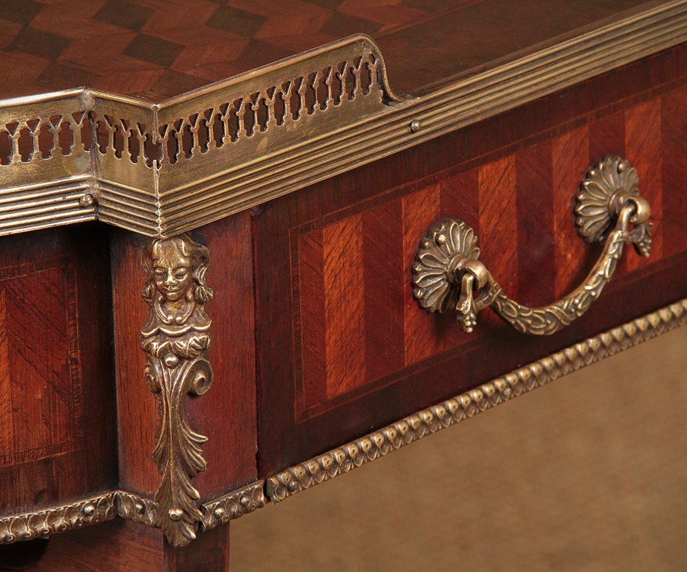 Beautiful little early 20th.c. kingwood parquetry veneered side table c.1910. Rounded ends to the top which features a floral marquetry inlaid panel at the centre of a pattern of contrasting veneers clevery arranged to make a three dimensional block effect. With a crossbanded rosewood border and a fine quality pierced brass gallery to the sides and rear. With a single drawer in the apron, also veneered and inlaid to match on the sides and rear. Raised on shaped and pieced legs with inlaid roundels at the sides. joined with a stretcher shelf, inlaid and veneered to match the top. Original brass handles and escutcheon to the drawer front. Brass mounts and mouldings to the apron and lower shelf. Minor wear to the top, otherwise excellent condition, cleaned and polished in our workshop. Key supplied.