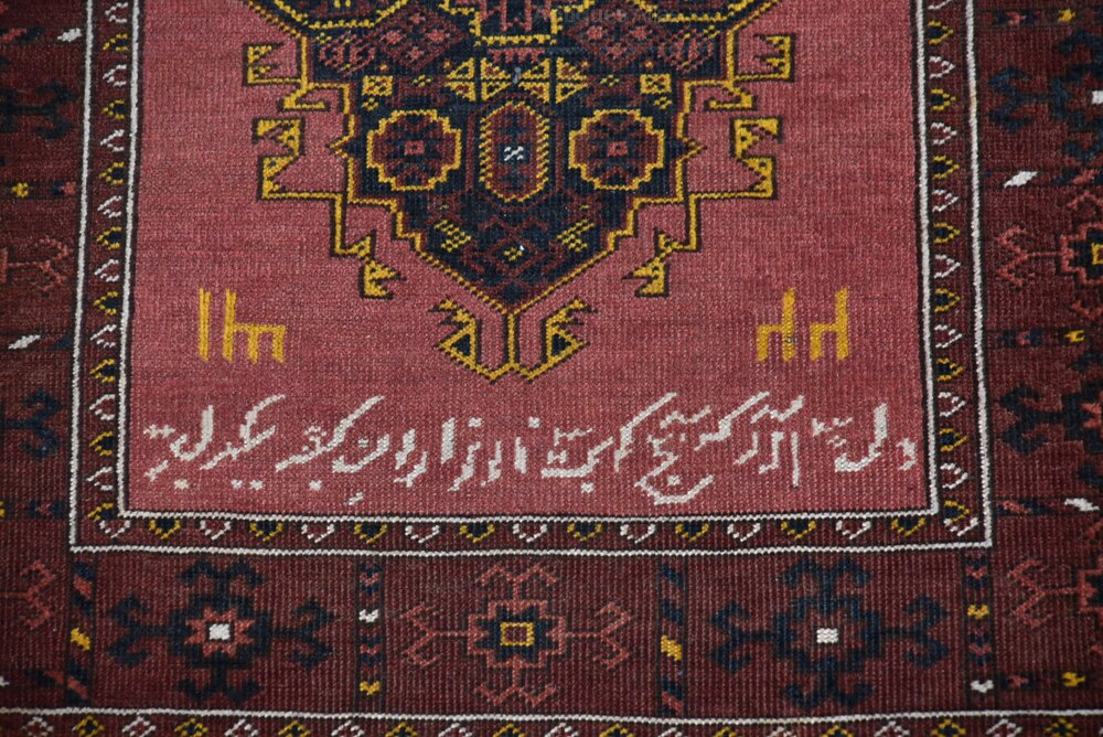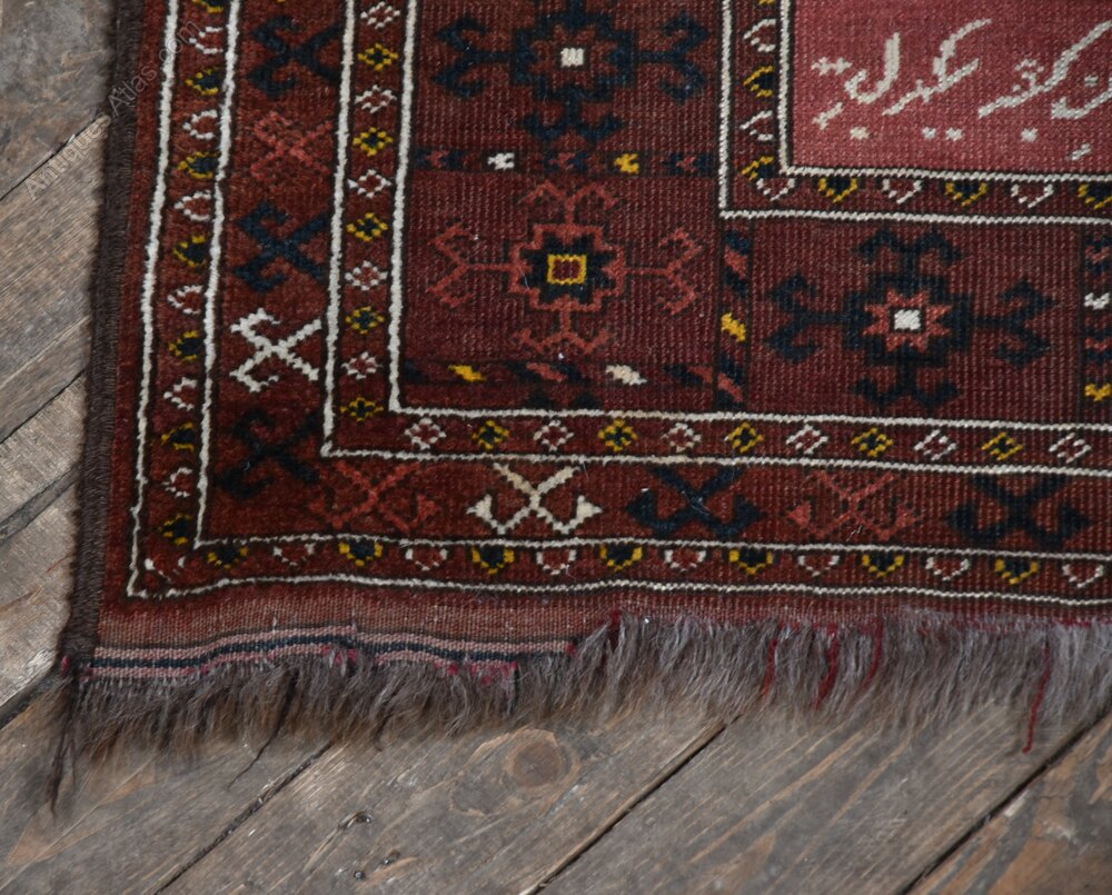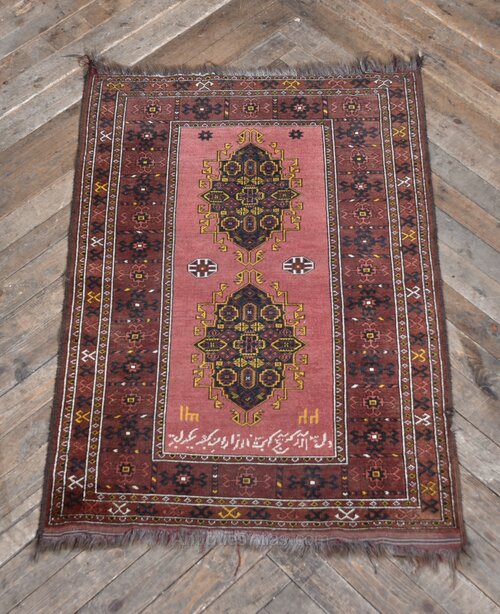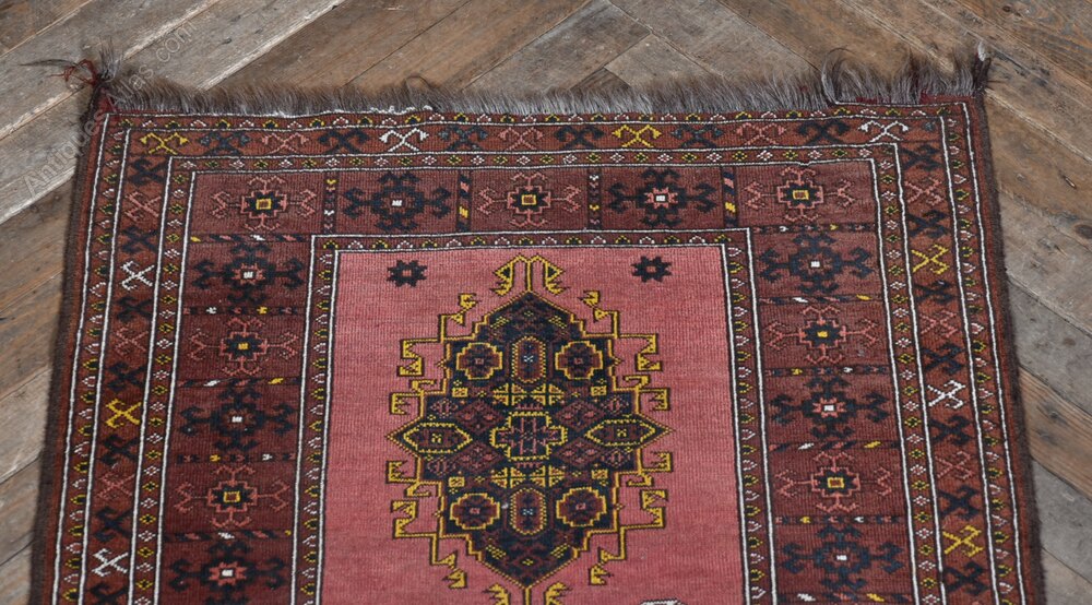 A striking hand‑woven woollen Persian rug in excellent antique condition. This finely woven rug has a warm terracotta centre with burgundy boarders and hand-knotted fringe all add to an inviting sense of warmth and vibrancy to any interior. A small white inscription, likely the weaver’s signature, adds a charming personal touch. Though it carries a few minor imperfections, it remains free from holes and retains full structural integrity. Rich in texture and character, it makes a compelling statement across both traditional and contemporary spaces.