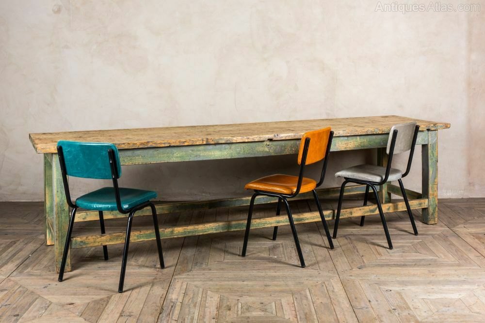 This pine table dates from the 1940s, and still features its original distressed paintwork. The table would suit any rustic or industrial style space. It could seat up to 10 people depending on your choice of chairs we think it looks fantastic paired with our leather ‘Shoreditch’ stacking chairs. See our eBay shop for more.