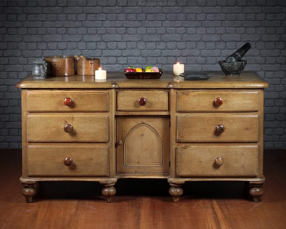 Splendid mid 19th.c. inverted breakfront pine kitchen dresser base c.1860. Impressive 2” thick counter top with rounded corners and a moulded edge. Over seven drawers of graduated depth with turned wooden knobs arranged around a small central cupboard with a gothic arch door panel. On the original turned feet. Excellent condition, minor wear and repairs to the top, cleaned and waxed in our workshops.