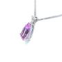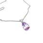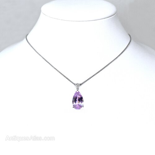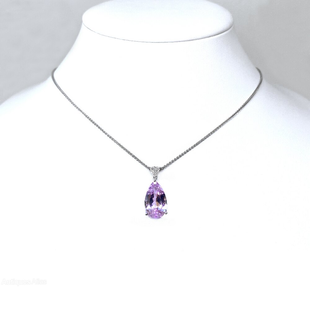 This lovely necklace has a pear shape kunzite measuring approximately 5.60 carats and a triangular diamond which measures approximately 0.25 carats set in 18 carat gold and chain. The necklace measures 18 inches (46 cms) in length. Weight 7.20 grams.