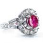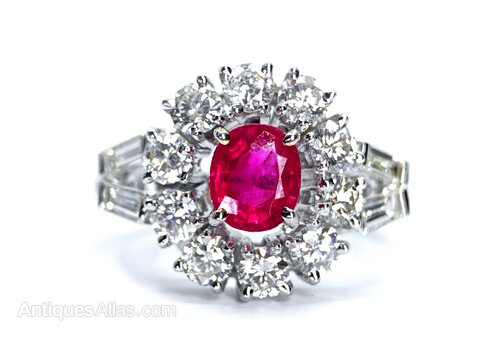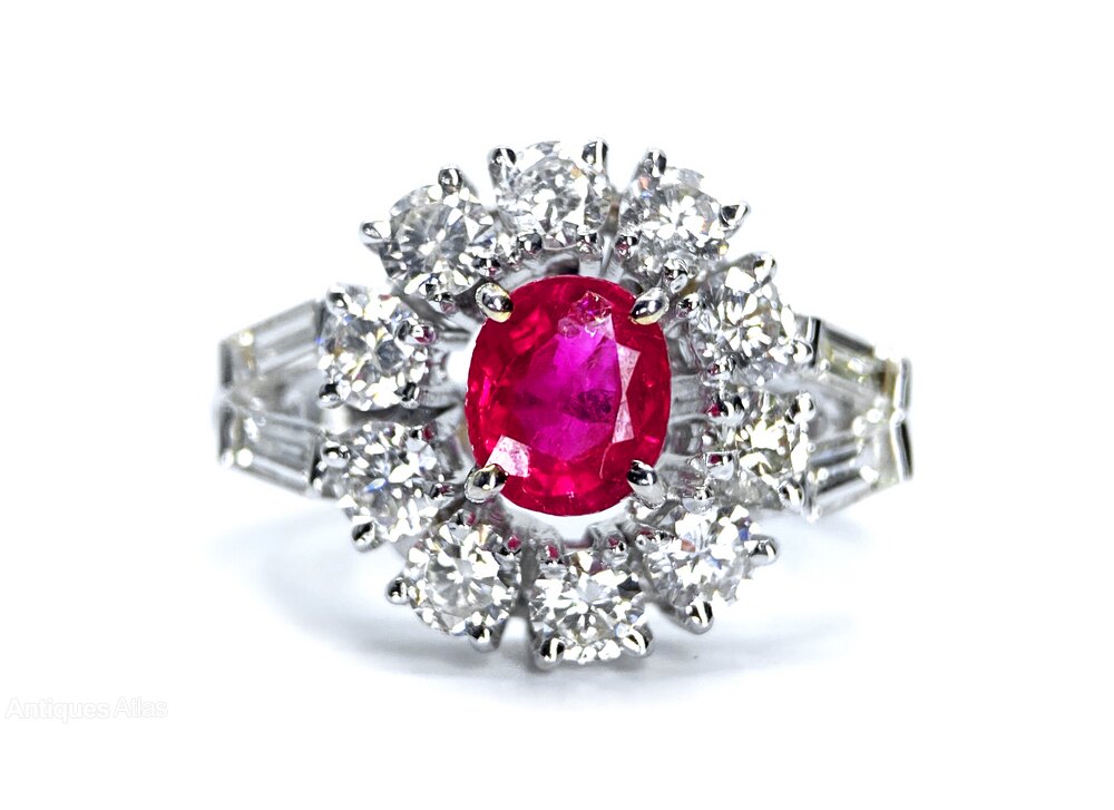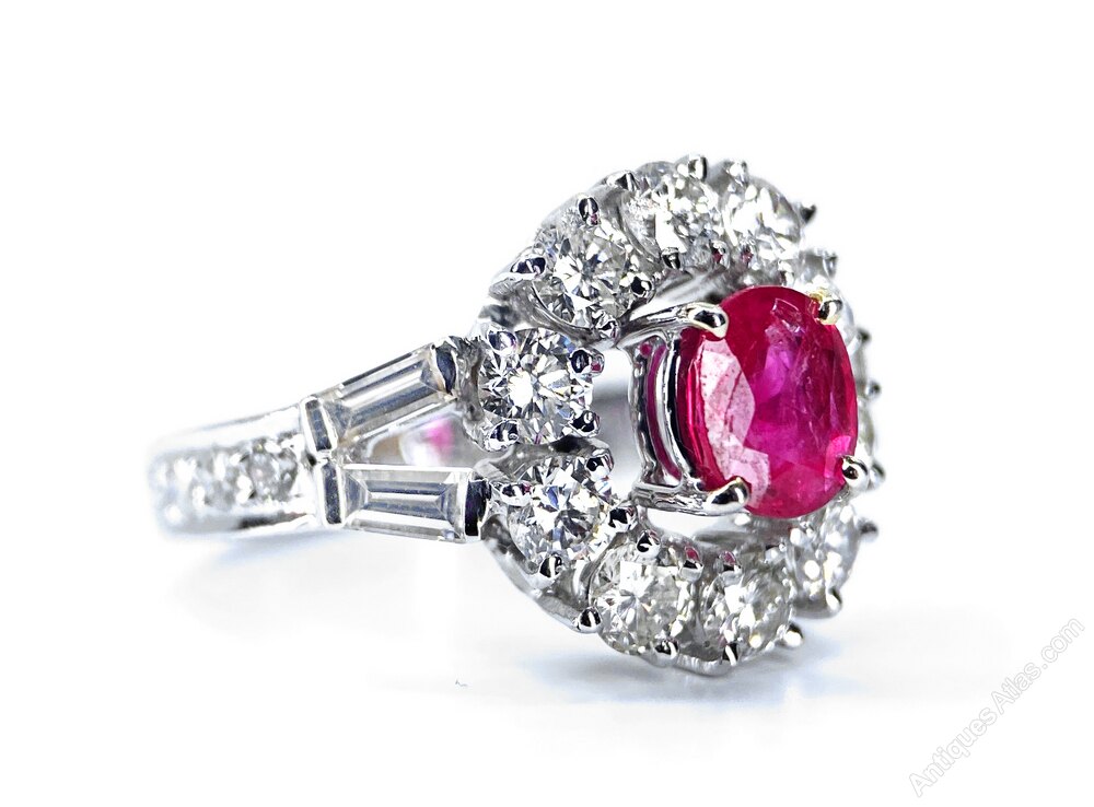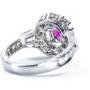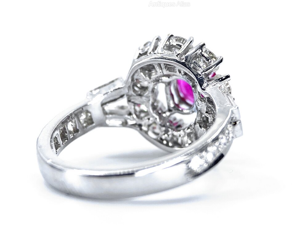 This is a fabulous ring. Approximately 0.80 carats of pink sapphire with 10 diamonds approximately 0.10 carats each surrounding the sapphire and 4 baguette diamonds approximately 0.05 carats each on the shoulders plus 8 diamonds approximately 0.04 carats each on the band.. Total diamonds 1.52 carats . All set in 18 carat white gold. The setting measures 20.60 mm across x 13.85mm. The ring size is K. The ring may be altered little. Weight 5.87 grams