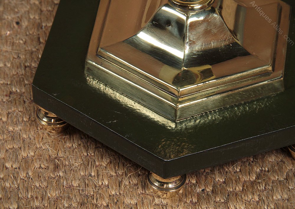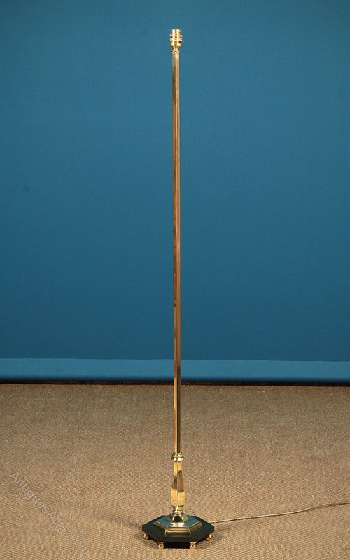 Smart polished brass standard lamp c.1960. Single bulb raised on a slim hexagonal section brass stem with shaped detail at the base. On a small but heavy green painted slate plinth with six turned brass feet. Excellent condition, cleaned rewired and PAT tested.