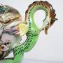 The structure has a rounded shape, the base is shaped with zoomorphic motifs, and the handles feature animals depicting marine creatures.