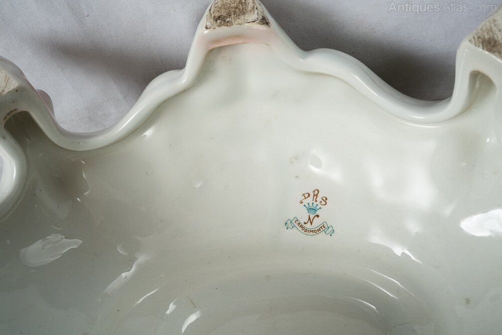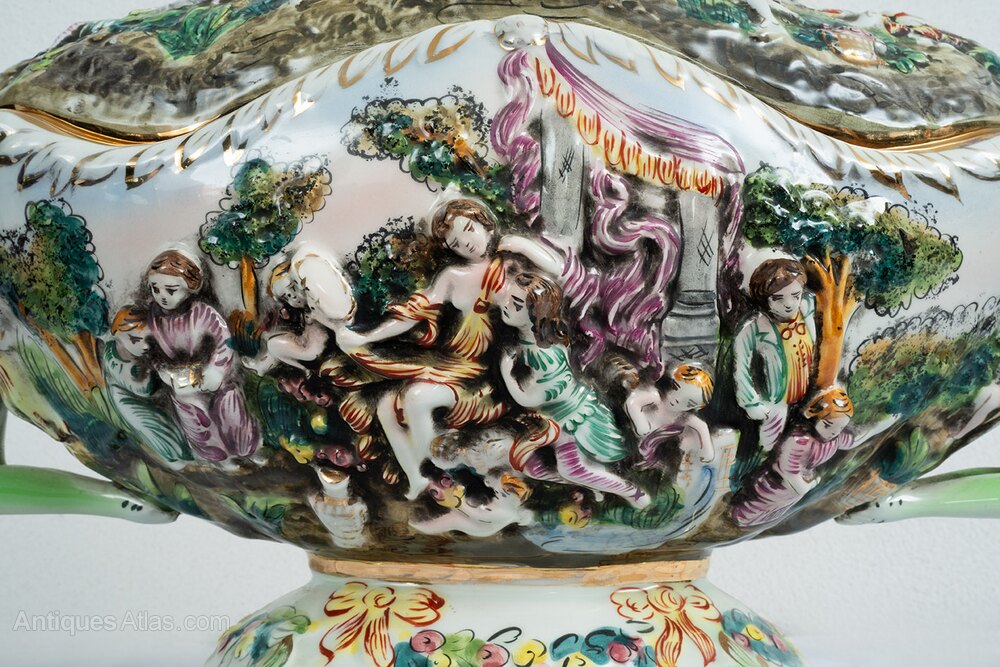 Description: Antique polychrome Capodimonte porcelain tureen from the mid-20th century.