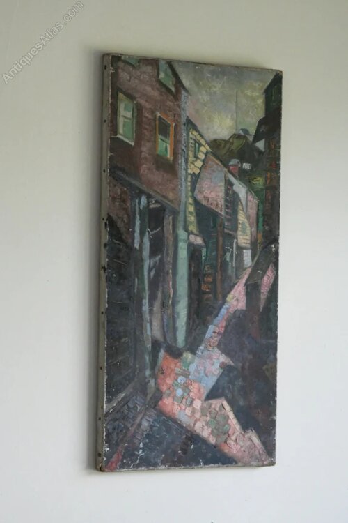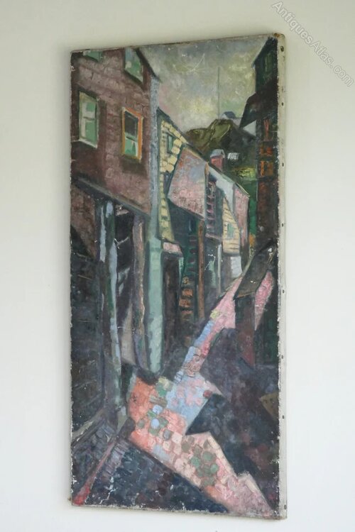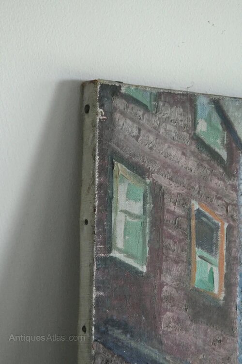 Portloe Abstract Street Scene Painting. Mid - late 20th Century small abstract street scene on canvas, marked in pencil to the rear C R Humberton