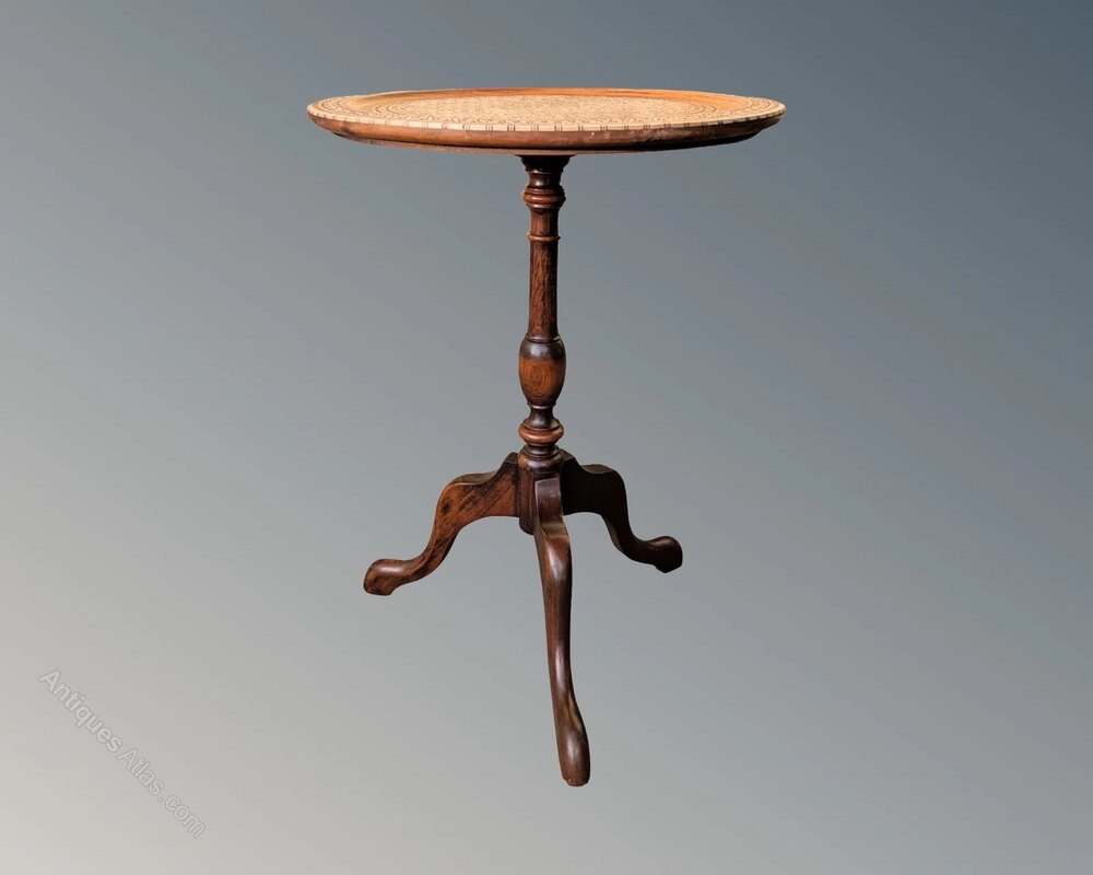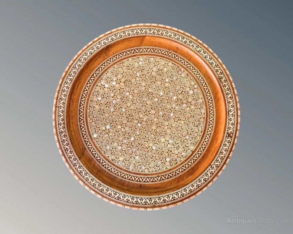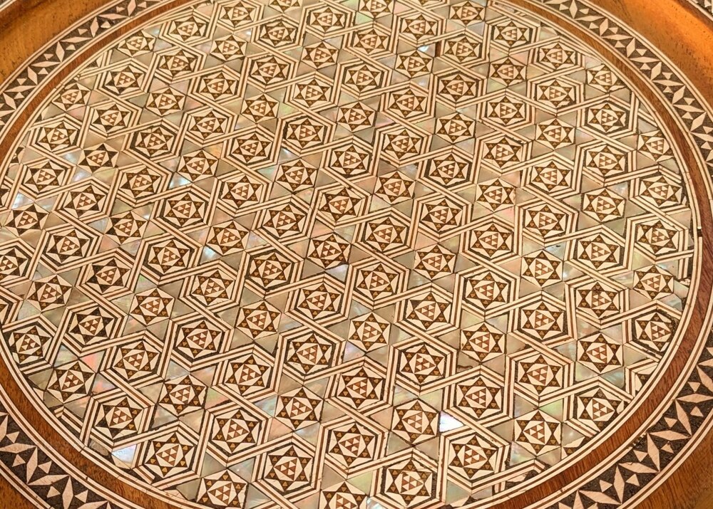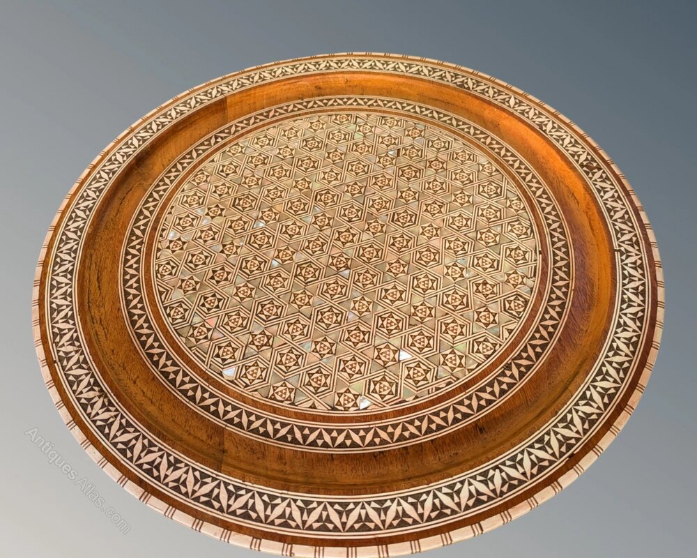 This pretty antique Syrian table is intricately inlaid with traditional Islamic/Middle Eastern designs, making it a unique and stunning piece of antique furniture. Crafted in the region of origin, it showcases the rich cultural influences and craftsmanship of the area. With its antique charm and exquisite details, this table is sure to add charm to any room.
