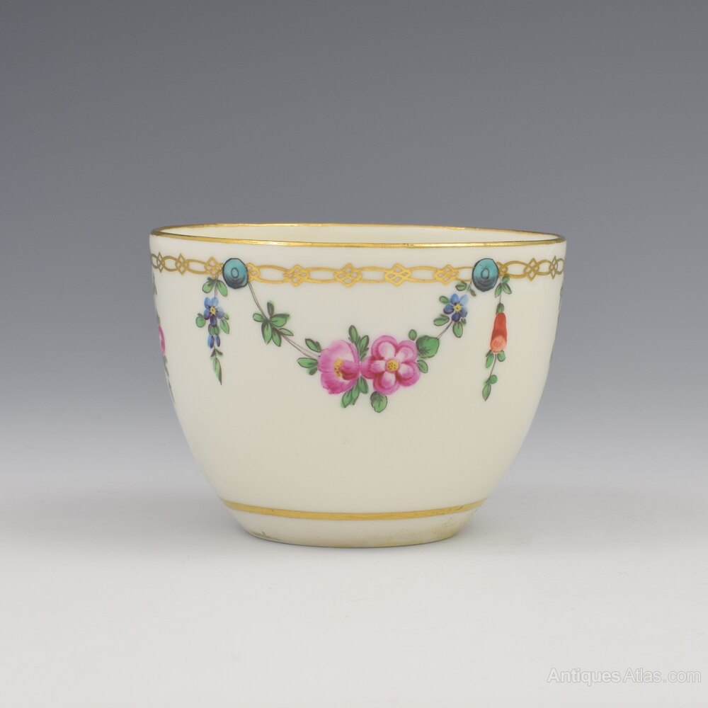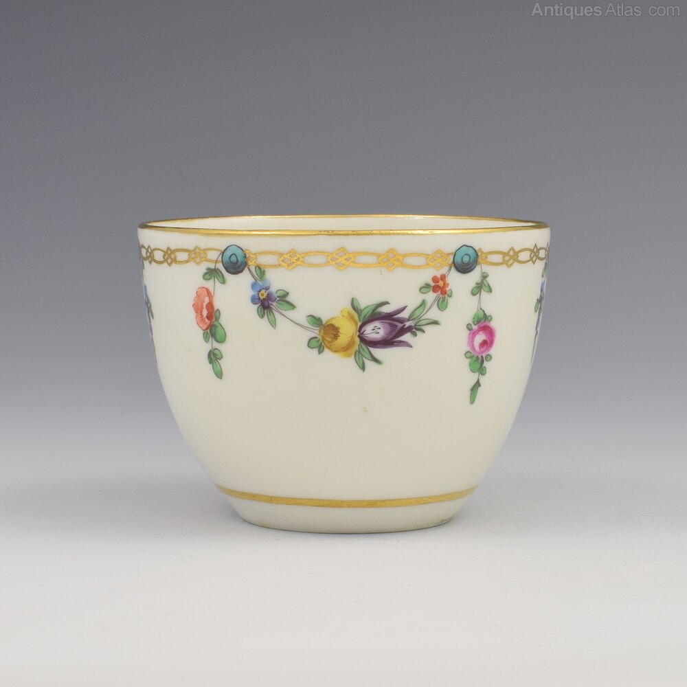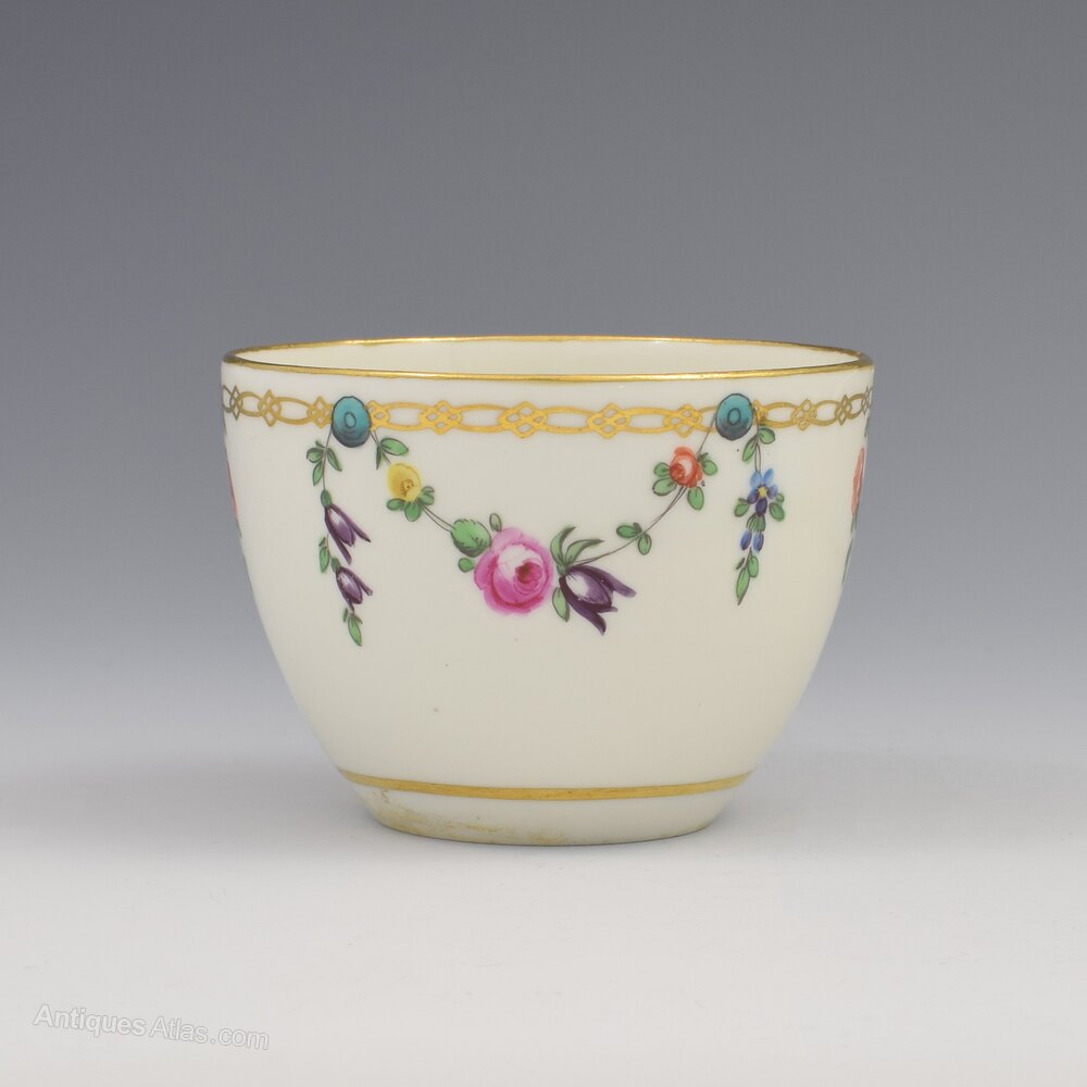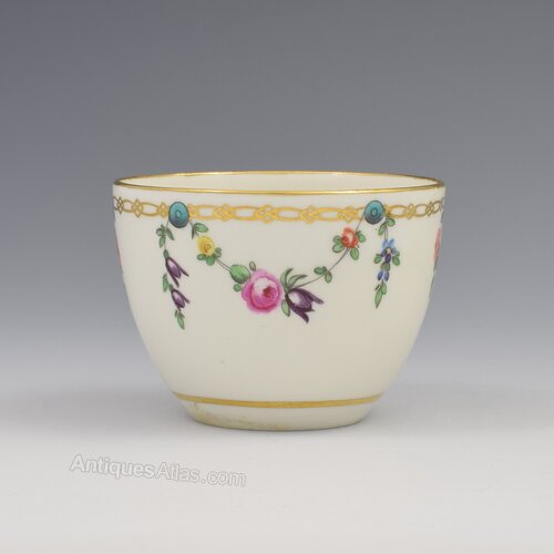 A very pretty Derby tea bowl, with a stylised gilt chain with links and knots, running just below the rim, suspended from which are three floral garlands draped over circular turquoise enamelled bosses. The garlands are painted in lovely, clear, bright enamels, green, pink, yellow, orange and deep purple. Finished with a gilt rim and ring above the foot. Puce crown and batons mark, c.1875-1800.