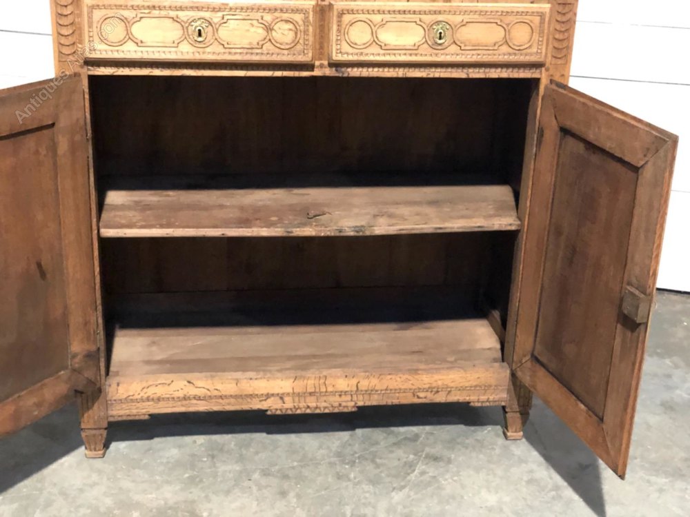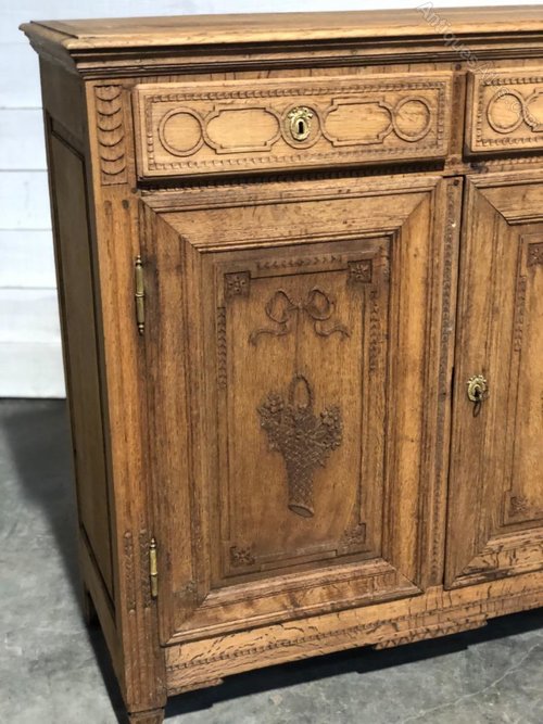 A pretty French Oak 2 Door Buffet dating to the early 19th Century. Love the 2 baskets carved into the doors. Single shelf in the bottom.