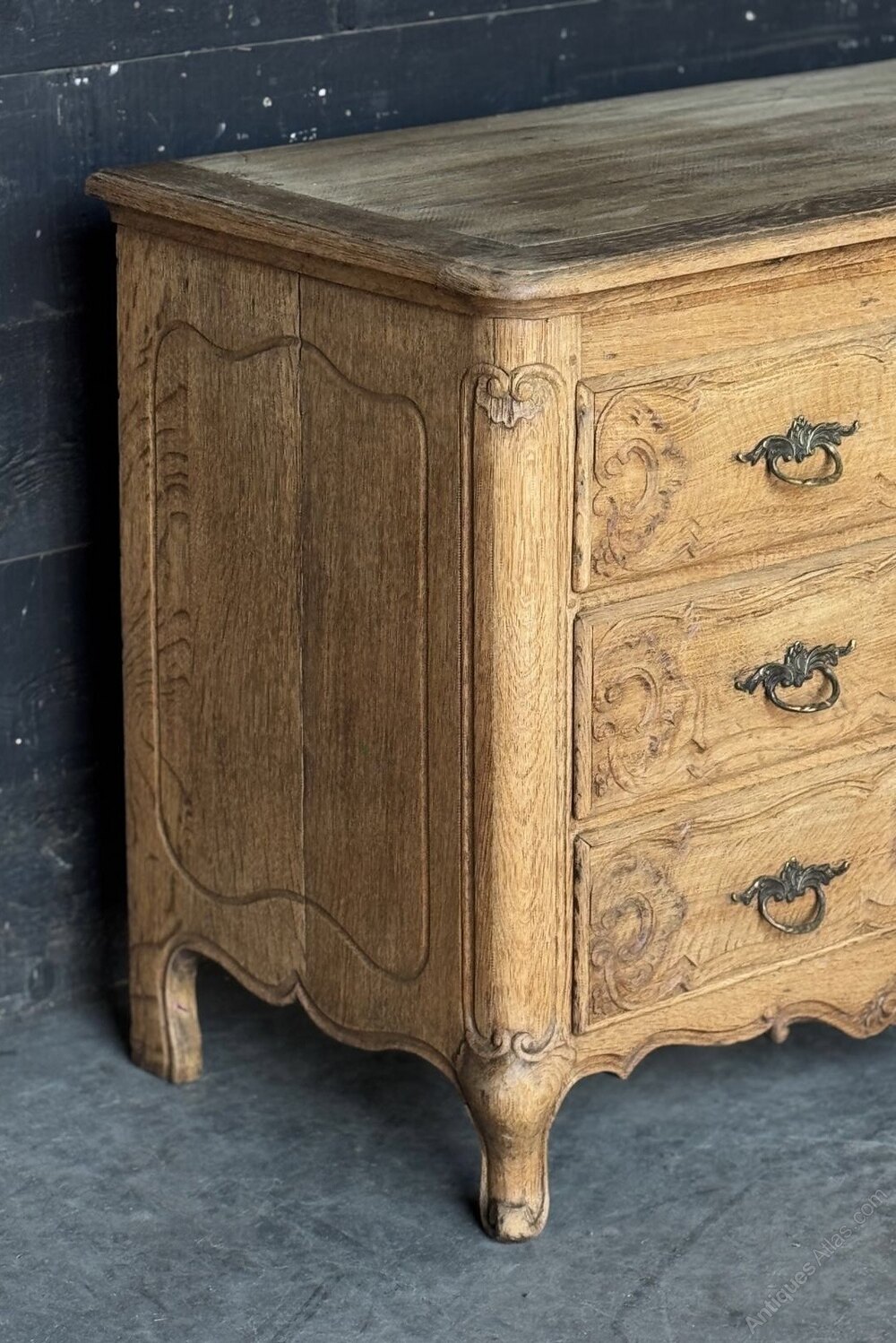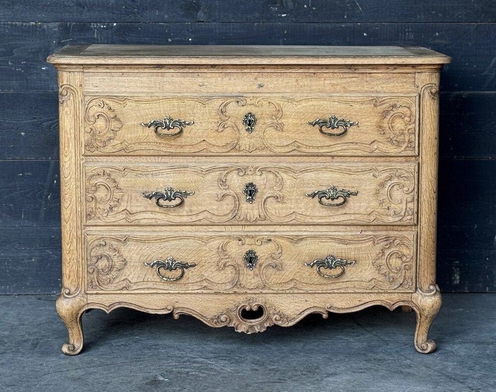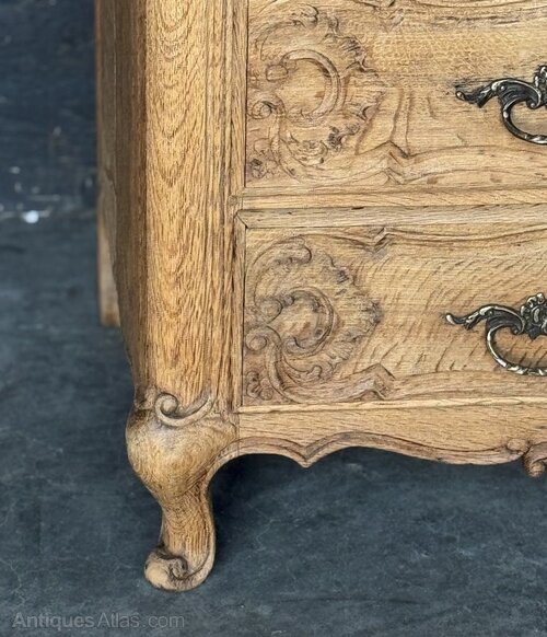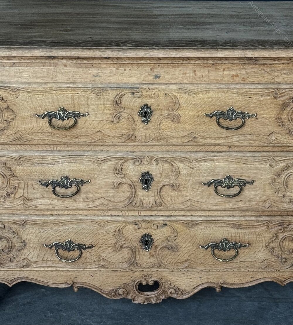 A delightful French Commode Chest of Drawers, made from Oak and dating to around 1900. The 3 drawers run smoothly, very pretty carved detailing and original handles. Of good quality construction we have bleached it for a lighter look. In overall excellent original condition for the home.