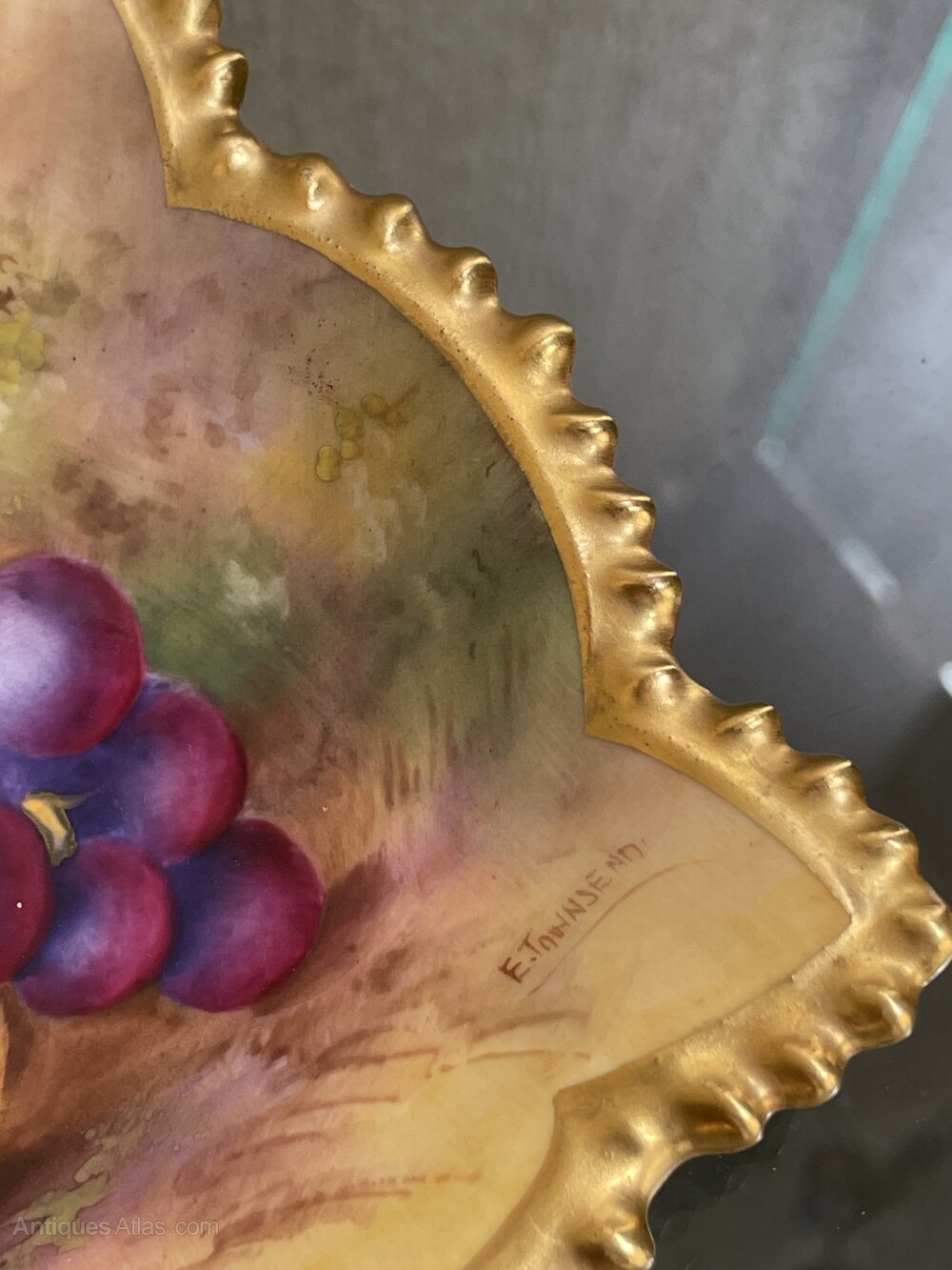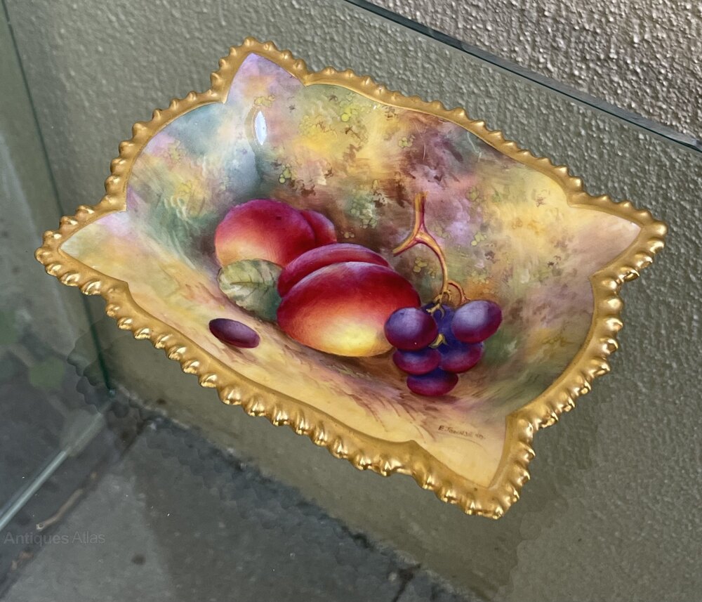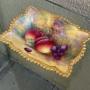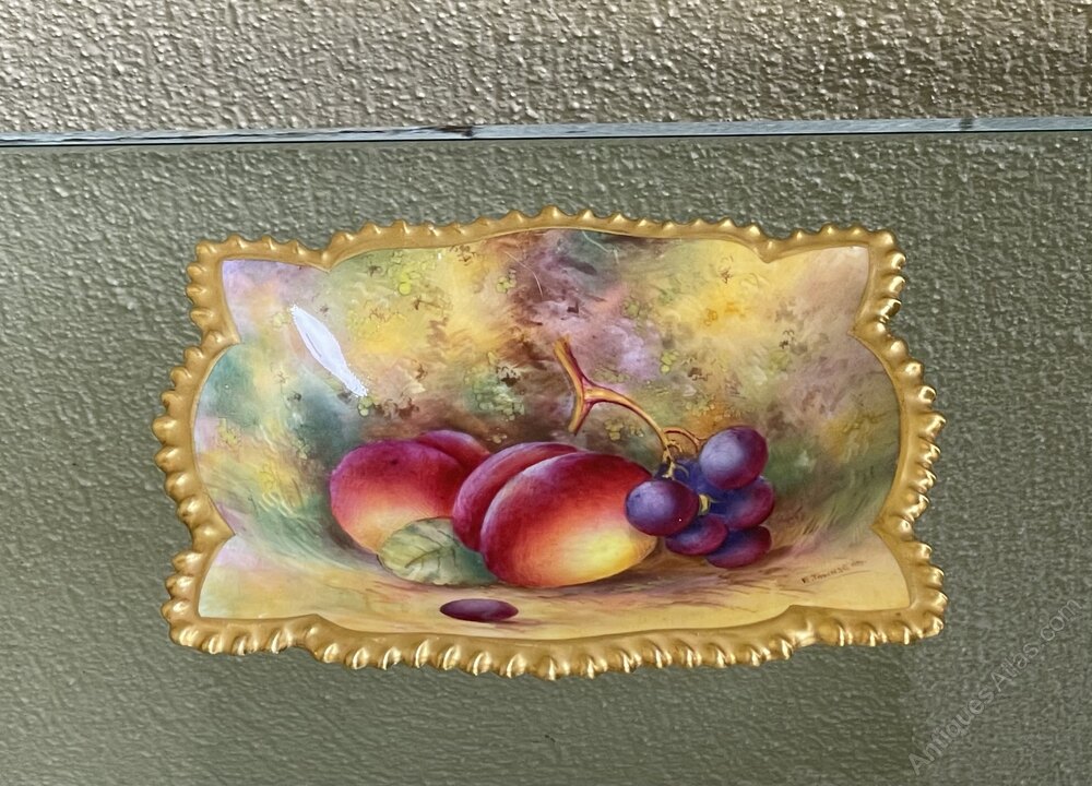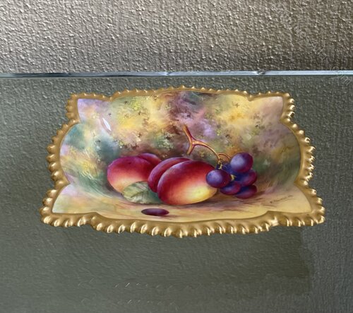 A very pretty Royal Worcester pin dish painted by E Townsend, decorated with peaches and grapes with gilt border.