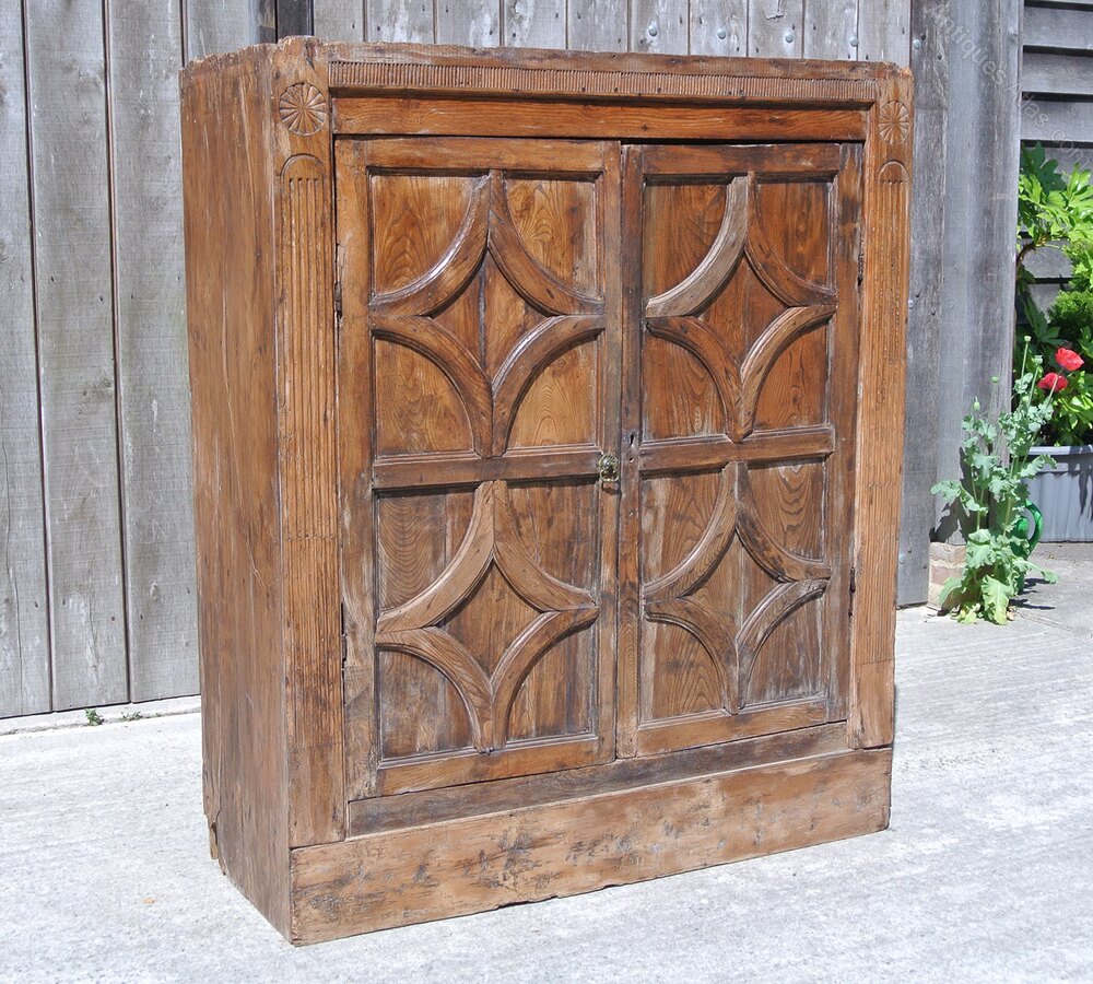 The doors open to reveal a carved arched show frame with matching reeded columns, large quarter pinwheels and a central scroll - again in solid elm. There are two original elm shelves within and both sides are formed from a pair of thickly cut and substantial elm boards. The top boards are original also.