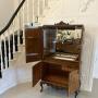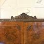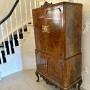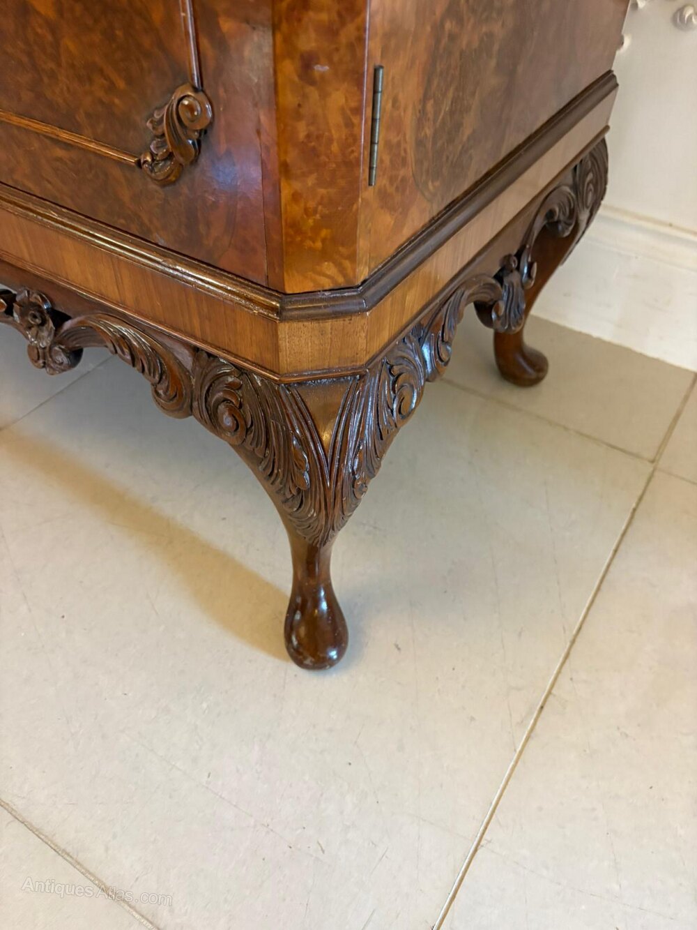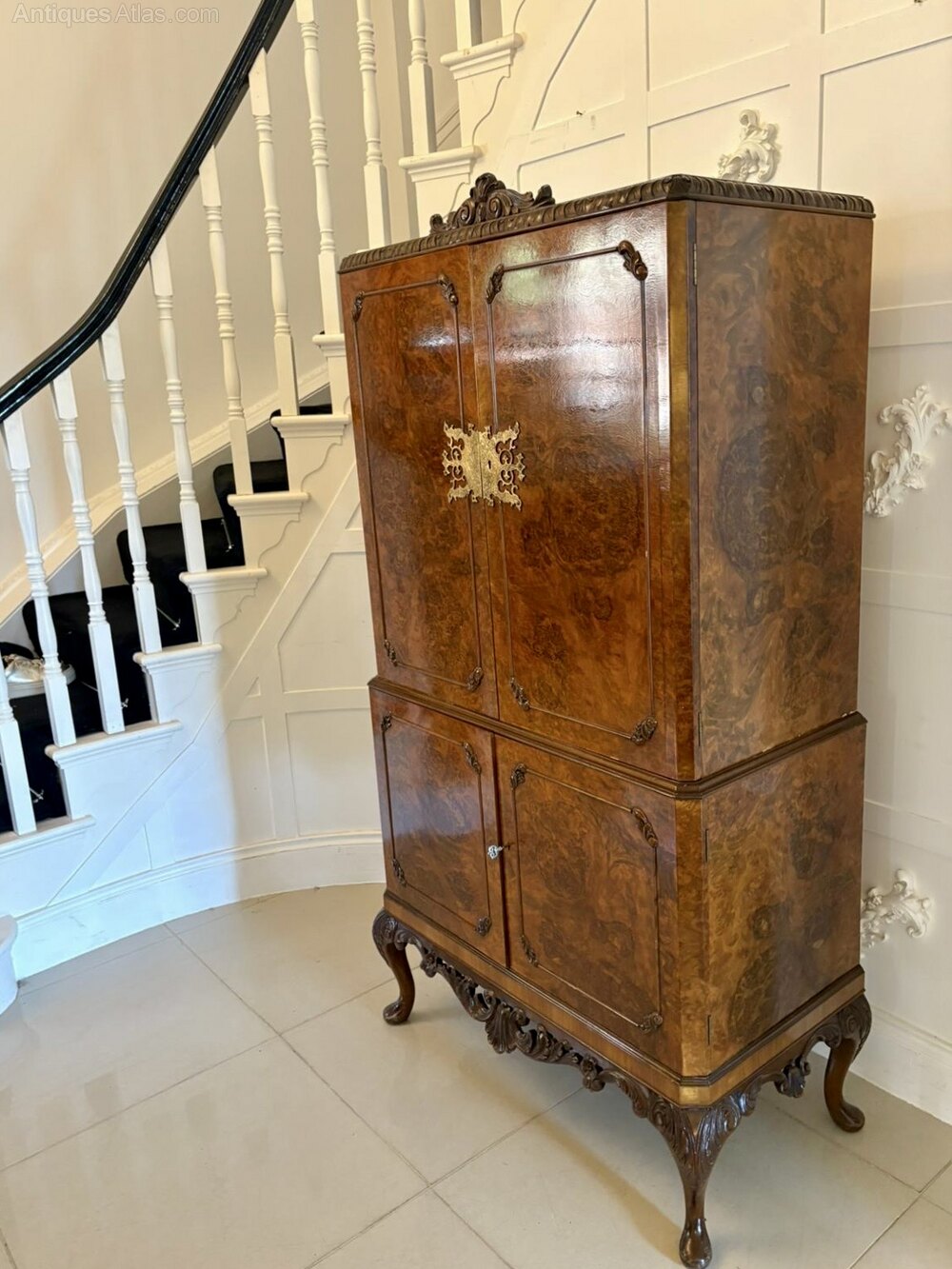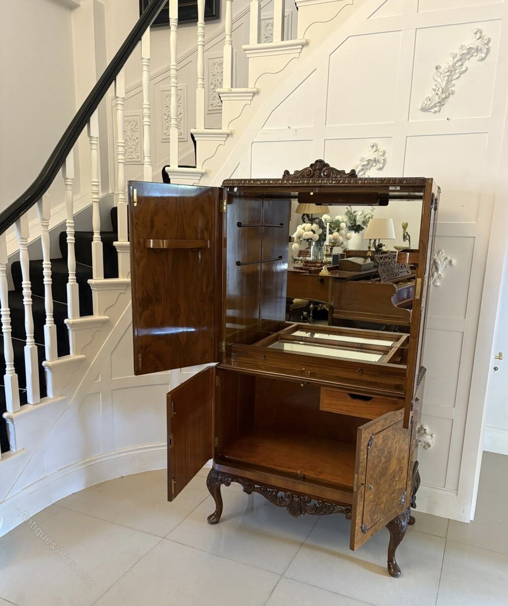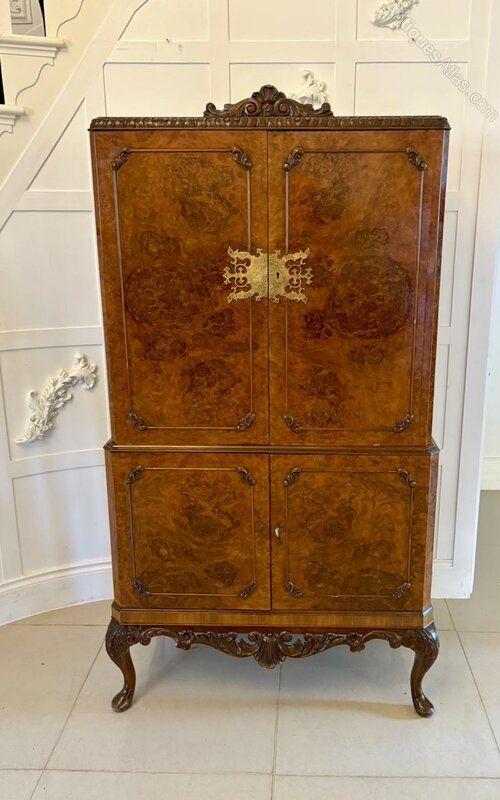 Outstanding quality antique burr walnut cocktail cabinet. The top section boasts a polished top and a carved walnut pediment above a pair of quality burr walnut doors with delightful original engraved brass lock plate. The doors open to reveal a fitted interior consisting of mirrored back and base, two glass shelves, slide out mirrored tray and fitted shelves to the back of the doors to store glasses etc. The sides are walnut with a bottom section having a charming walnut frieze, quality burr walnut doors with original mouldings and carvings opening to reveal a storage compartment and a drawer. It stands on shaped carved walnut cabriole legs with pad feet and united by a shaped carved walnut apron. It has the original key.