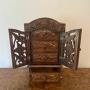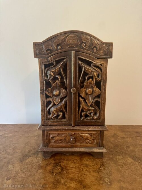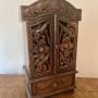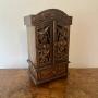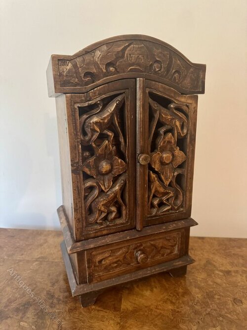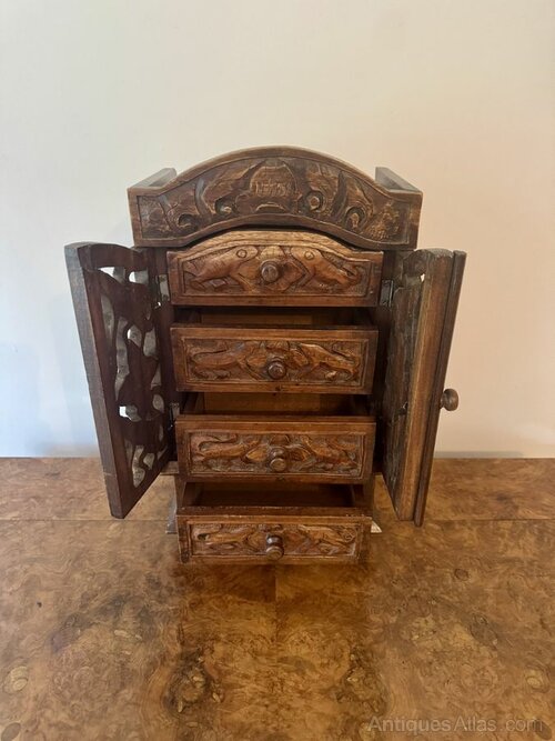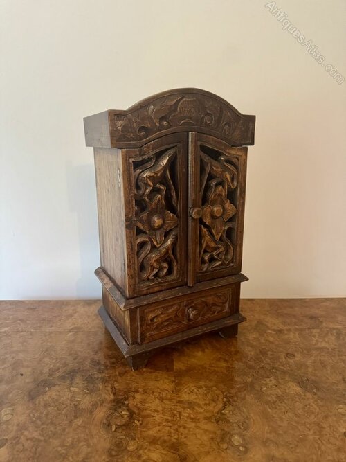 Quality antique carved oak tabletop cabinet, having a quality carved oak tabletop cabinet with a arched shaped top above a pair of carved oak doors, opening to reveal four fitted drawers.