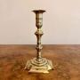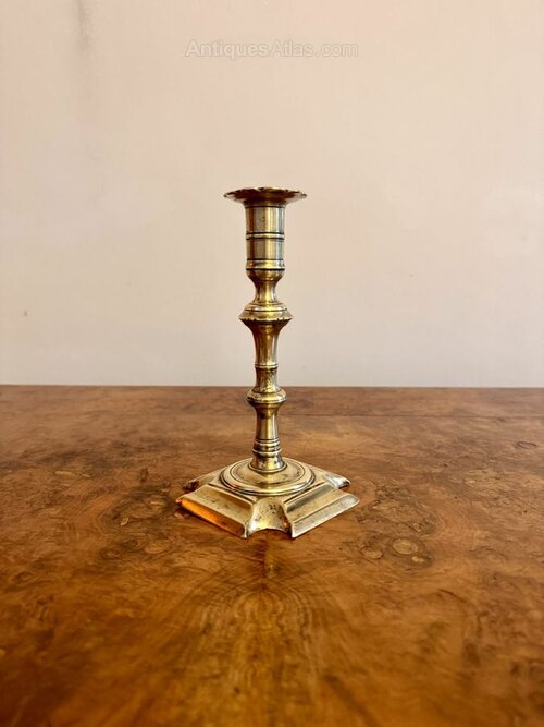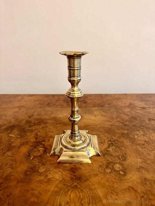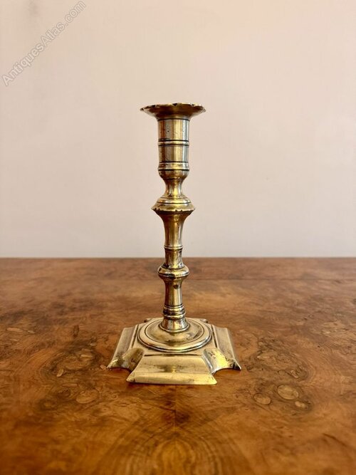 Quality antique Queen Ann brass candlestick, having a quality original antique Queen Ann brass candlestick raised on a shaped base.