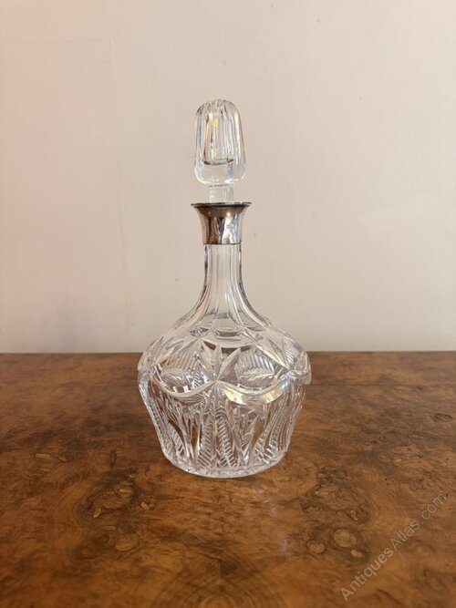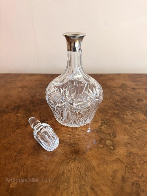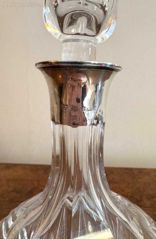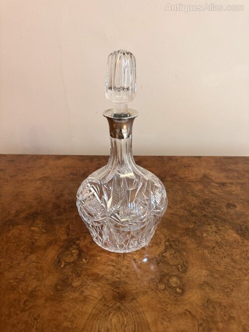 Quality antique Silver collar decanter, having a quality antique Silver hallmarked collar decanter with a bulbous shaped cut glass body terminating into a slender neck with a silver collar and the original cut glass decanter.