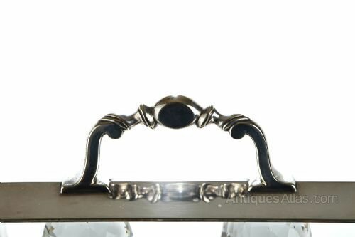 Fine Quality Antique Silver Plated Two Bottle Tantalus with surmounting handle, the top bar released by pressing down on the lock plate. The tantalus houses two cut glass decanters with plated spirit labels standing on a plinth base. Lovely item both decorative and functional, all original.