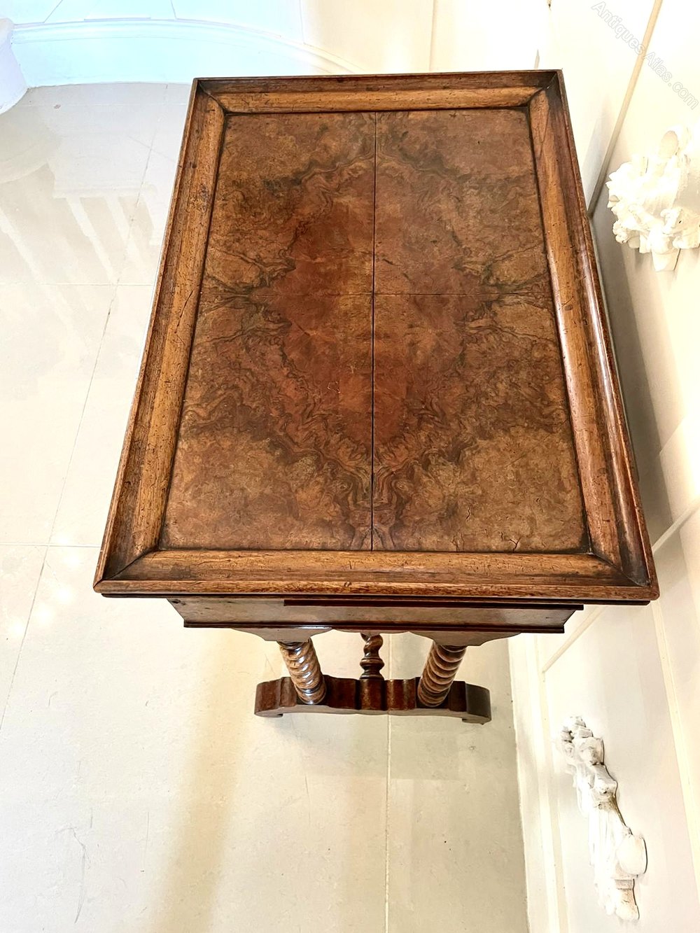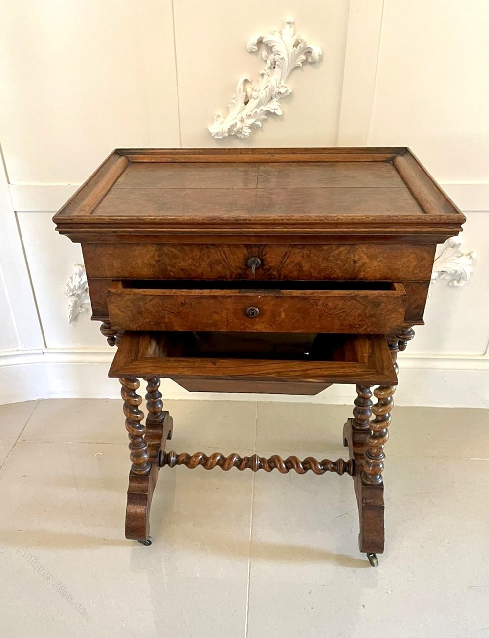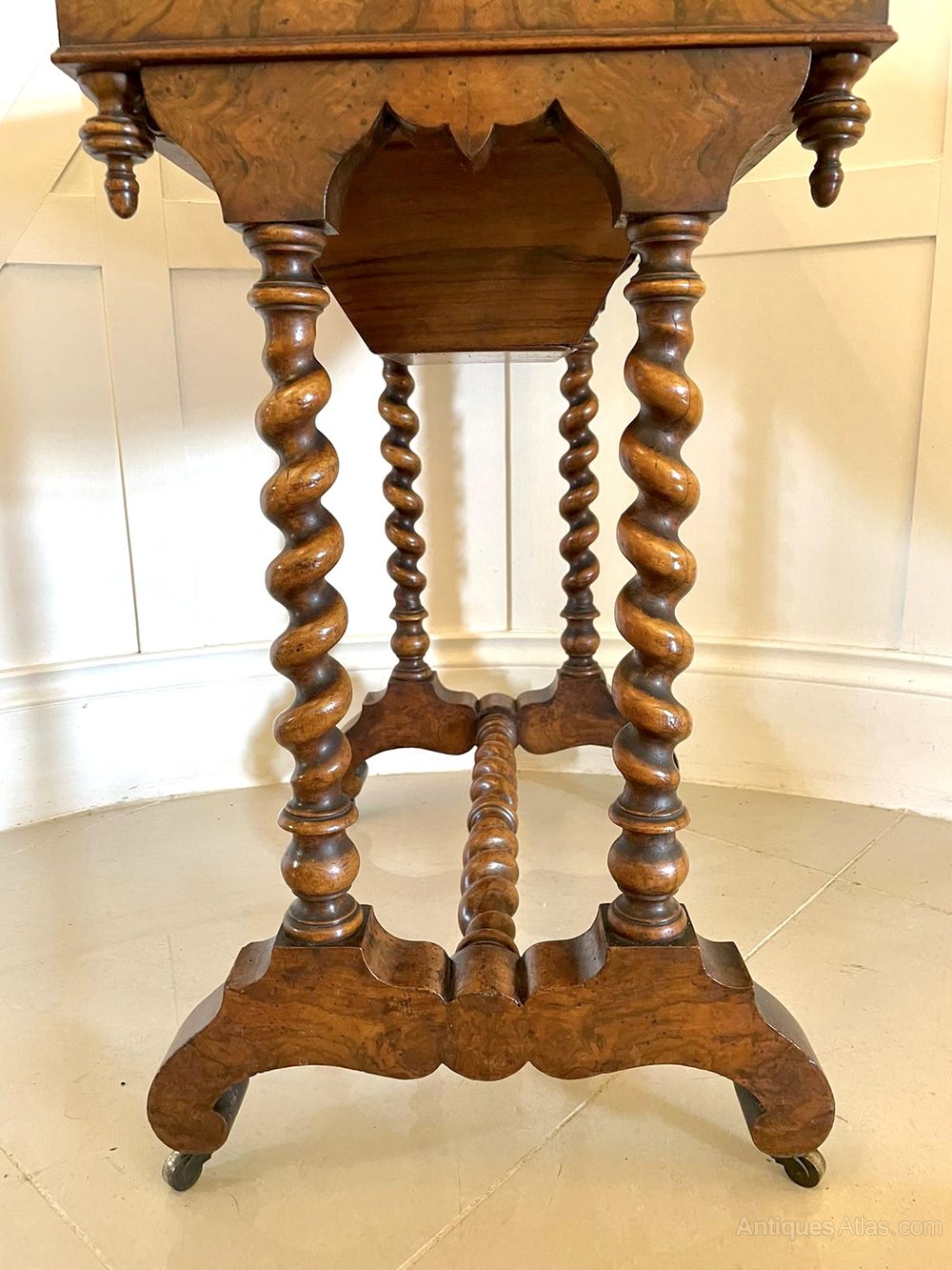 burr walnut drawer and a walnut swing basket. It boasts fantastic solid walnut barley twist end supports and stands on shaped cabriole legs united by a solid walnut barley twist stretcher with original turned walnut finals and original casters.