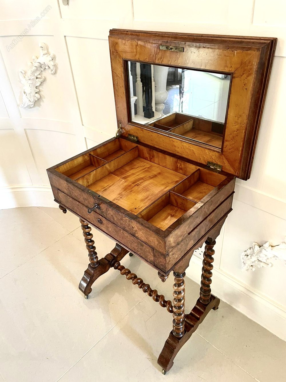 Fine quality antique Victorian burr walnut work table having a quality burr walnut lift up top with a moulded edge opening to reveal a fitted satinwood interior with the original fitted mirror above one