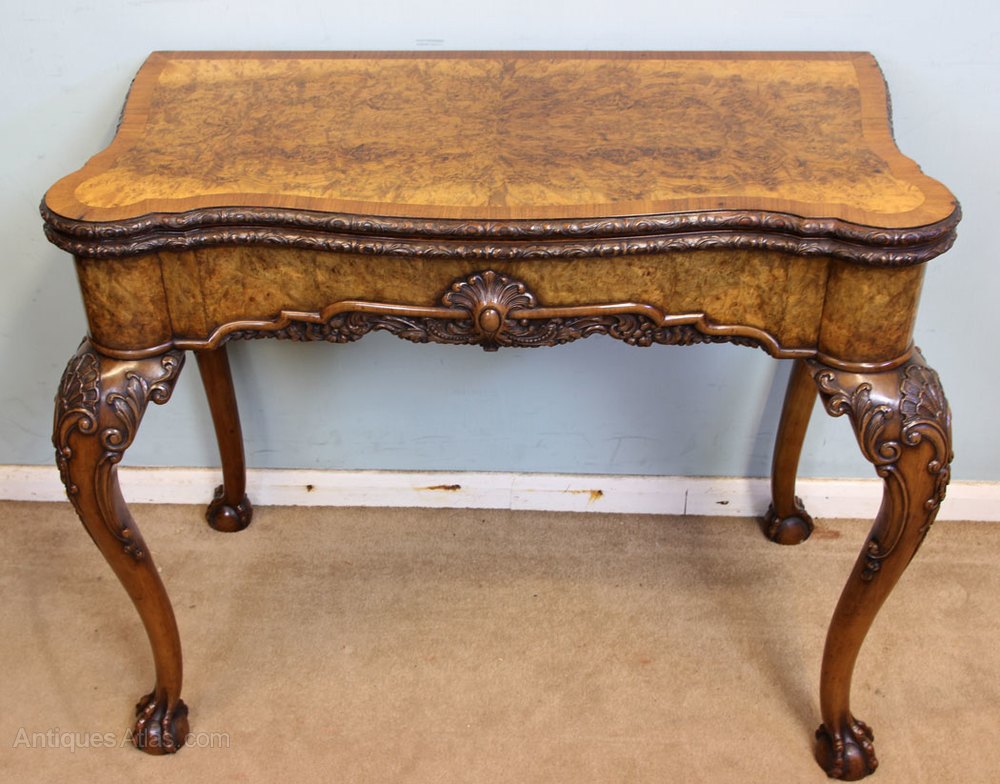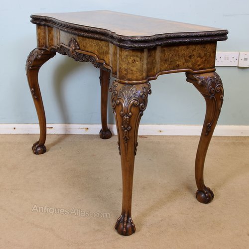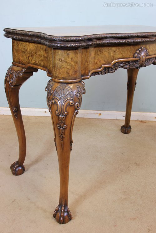 Antique Georgian Style Shaped Burr Walnut Card Table / Side Table. This fine quality burr walnut shaped games / side table has a lovely shaped burr walnut top with cross banded edge and carved detail, the top opens and turns to reveal storage compartment for cards and games, the interior has a baize lining and guinea wells to each corner. The shaped front has wonderful figured walnut with carved decoration to the centre and further carving under, all supported by wonderful cabriole shaped legs with lovely detailed carving to the knee and standing on ball and claw feet.