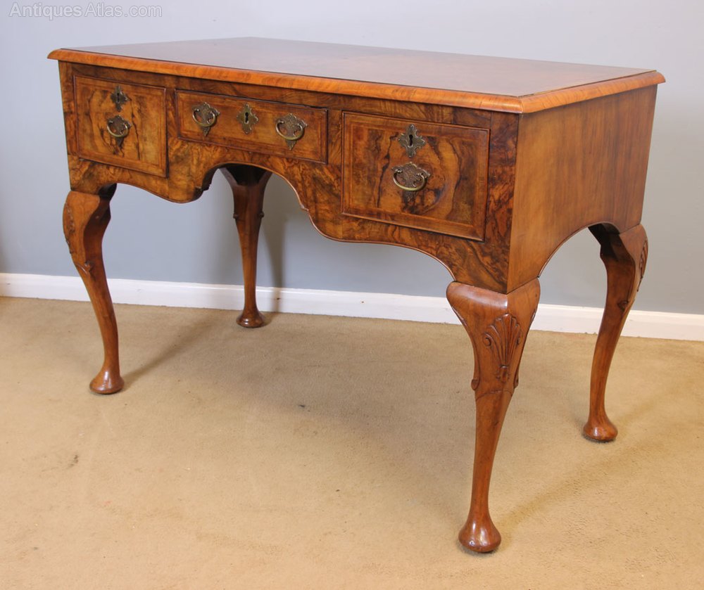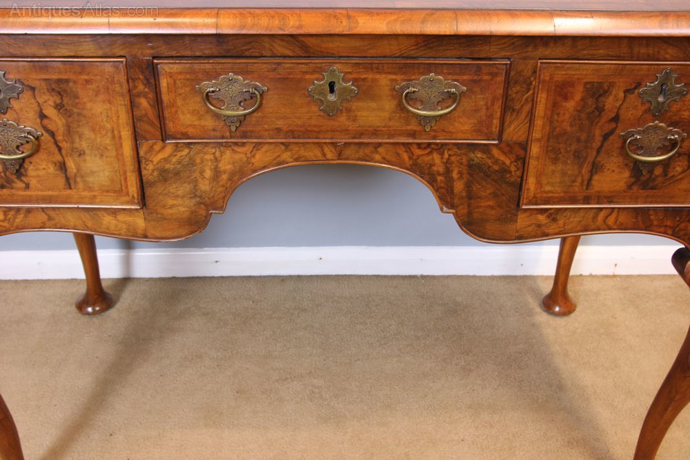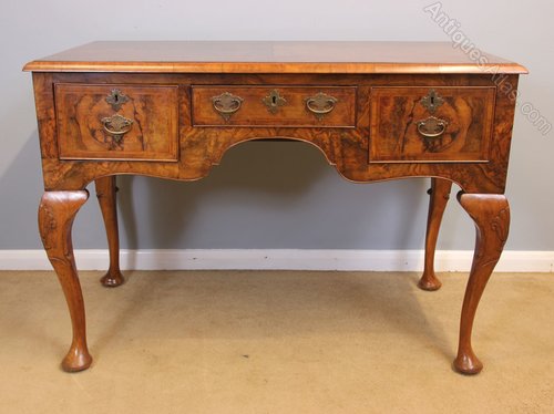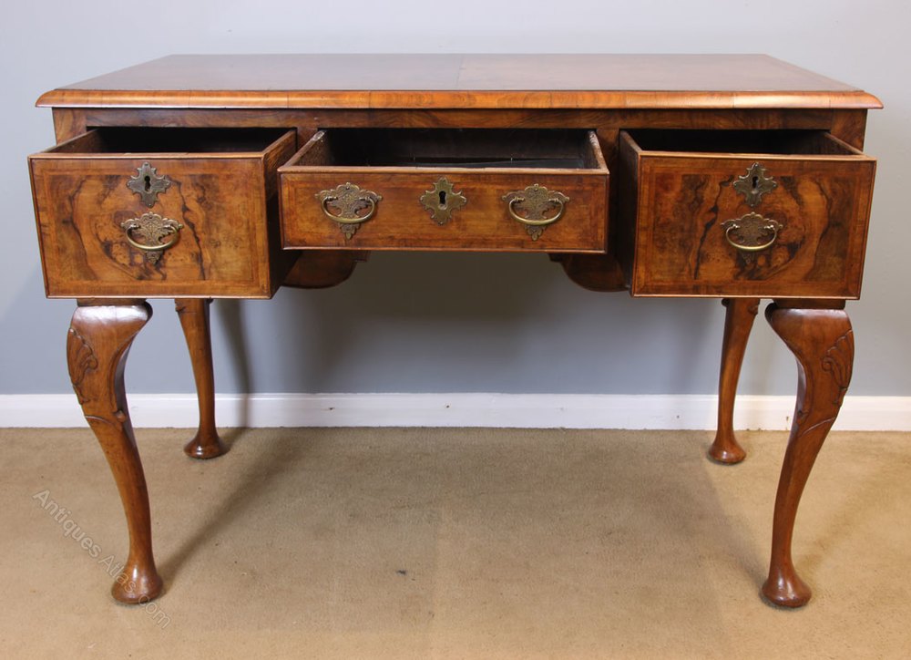 Quality Burr Walnut Side Table Writing Desk. This wonderful quality burr walnut side / dressing table / desk has a beautiful burr walnut top with crossbanded edge. Under having centre drawer with shaped kneehole under flanked either side by deep drawer all fitted with decorative brass handles and decorative brass key escutcheons. The drawer fronts are finished with wonderful burr walnut with crossbanded edge the front surrounding the drawers has lovely burr walnut. All supported by queen anna style legs with carved shell detail.