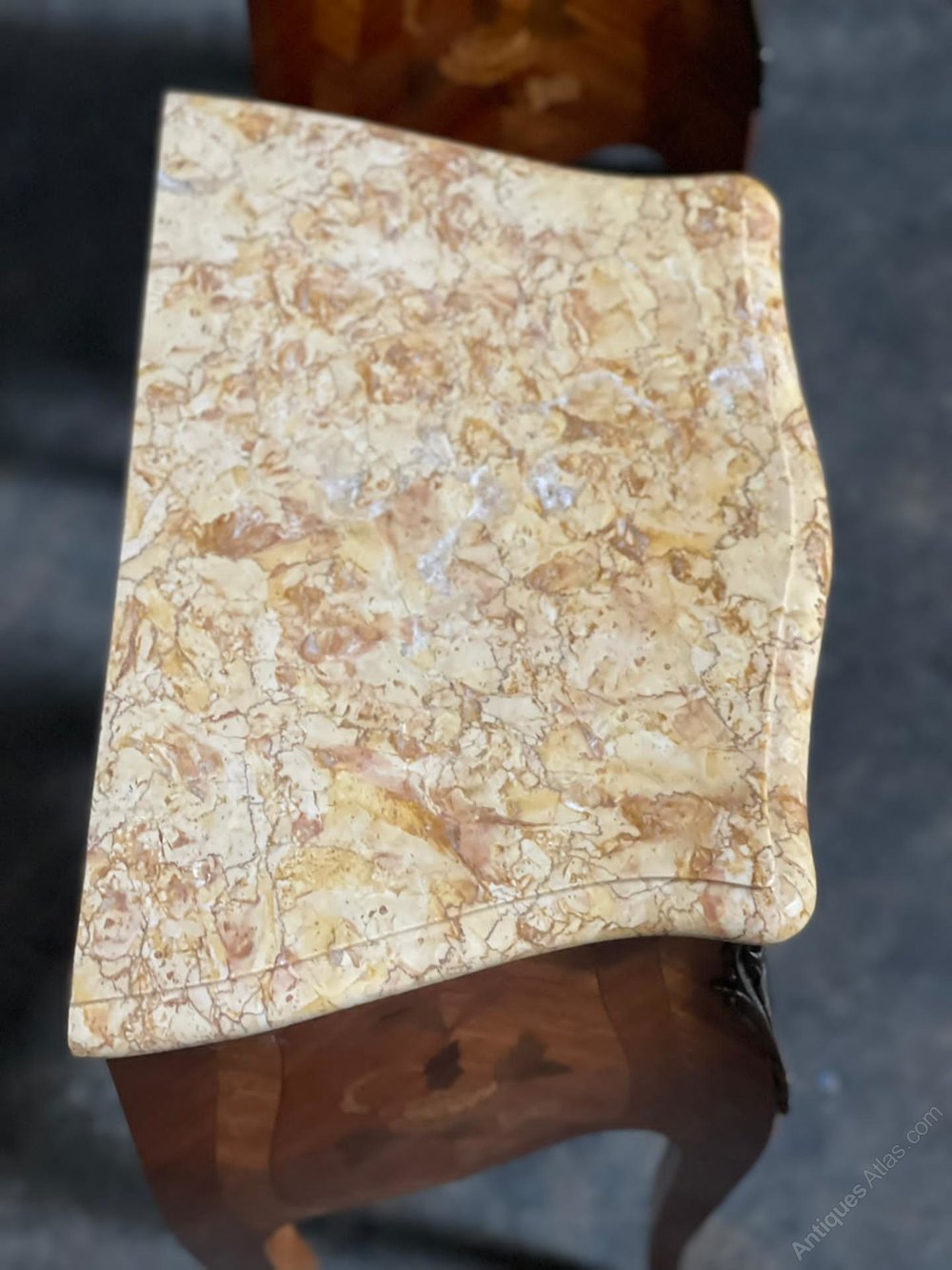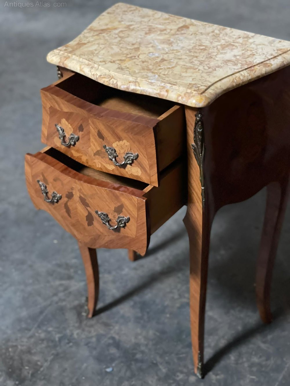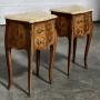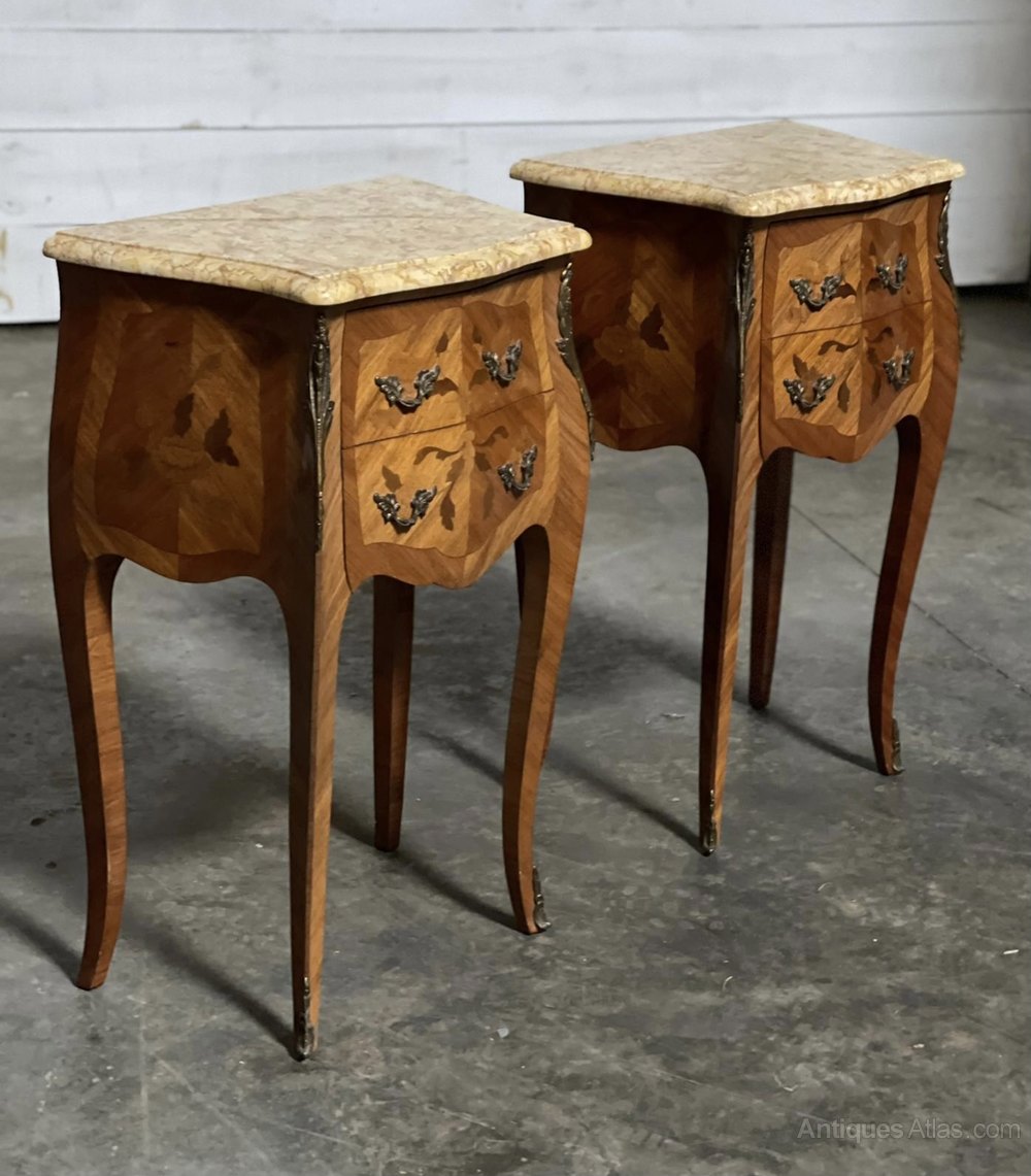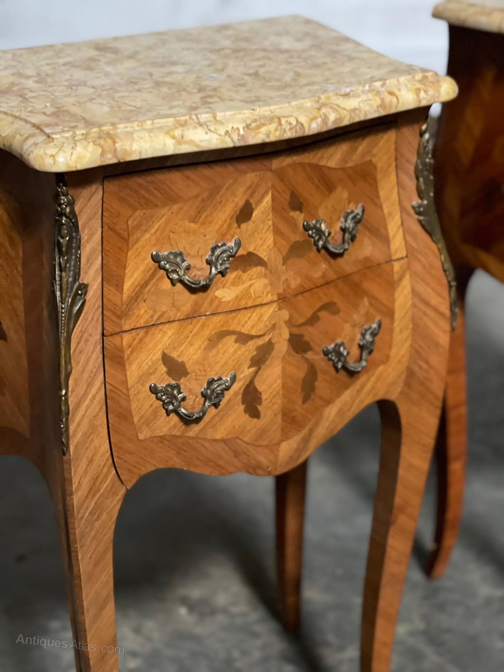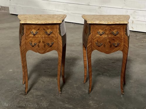 A superb quality pair of French bedside Drawers. Stamped by a French Cabinet maker and dating to the 1930s. Original marble tops in excellent condition. Made from Kingwood with inset marquetry and ormolu mounted. The drawers run smoothly.