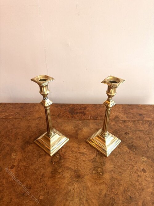 Quality pair of antique Regency brass candlesticks, having a quality pair of antique Regency brass candlesticks with square drip trays above a slender stem raised on a stepped base.