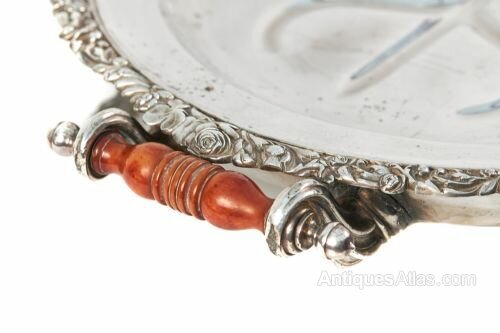 Large Antique Quality Silver Plated Meat Tray/Warming dish having a quality ornate border with original wooden carrying handles raised on shaped ornate feet.