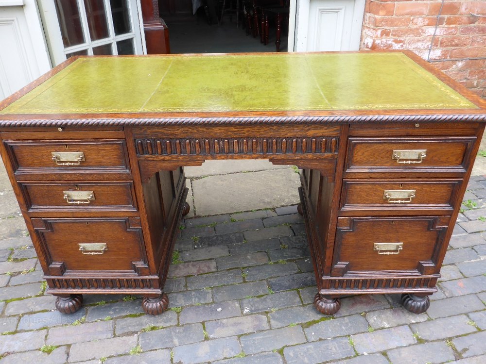 A Nice Edwardian Writing Desk in Oak, 6 drawers with 2 brushing slides, original brass handles, panelled to both outer and inner sides. in excellent condition, in one piece for transport.