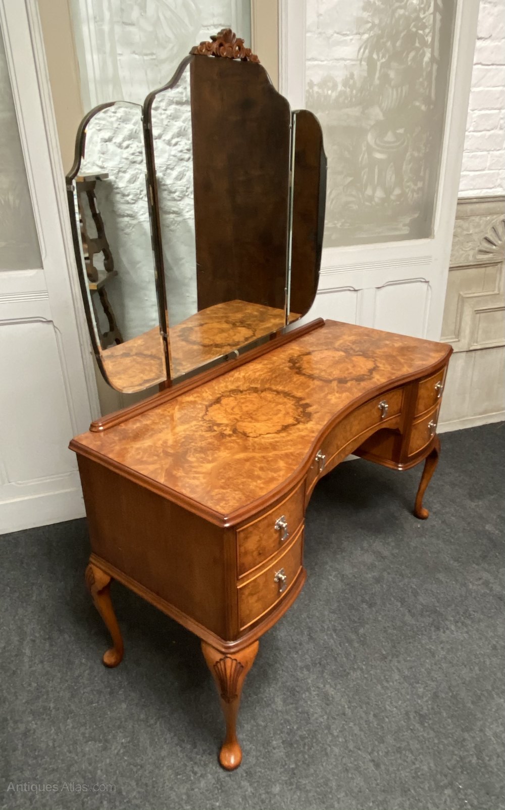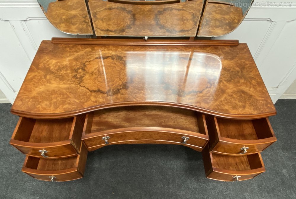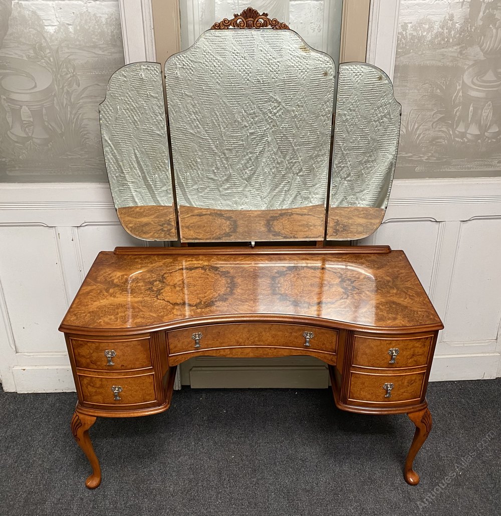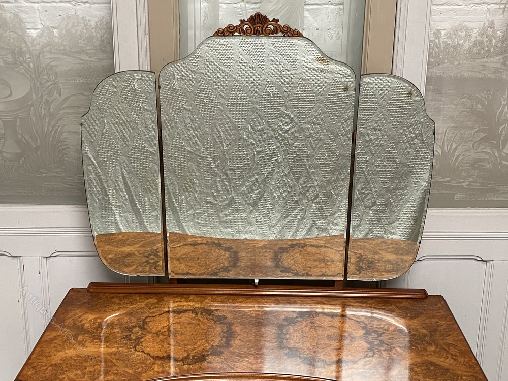 A lovely and stylish Burr Walnut Dressing Table. Queen Anne style and made from Walnut with nice tight Burr Walnut. All the drawers run smoothly fitted with the original handles. The 3 bevelled mirrors all move independently and are in great condition.