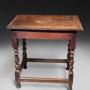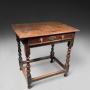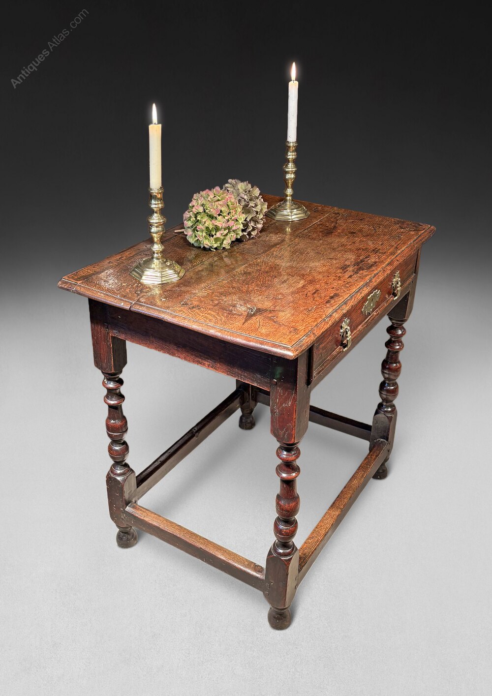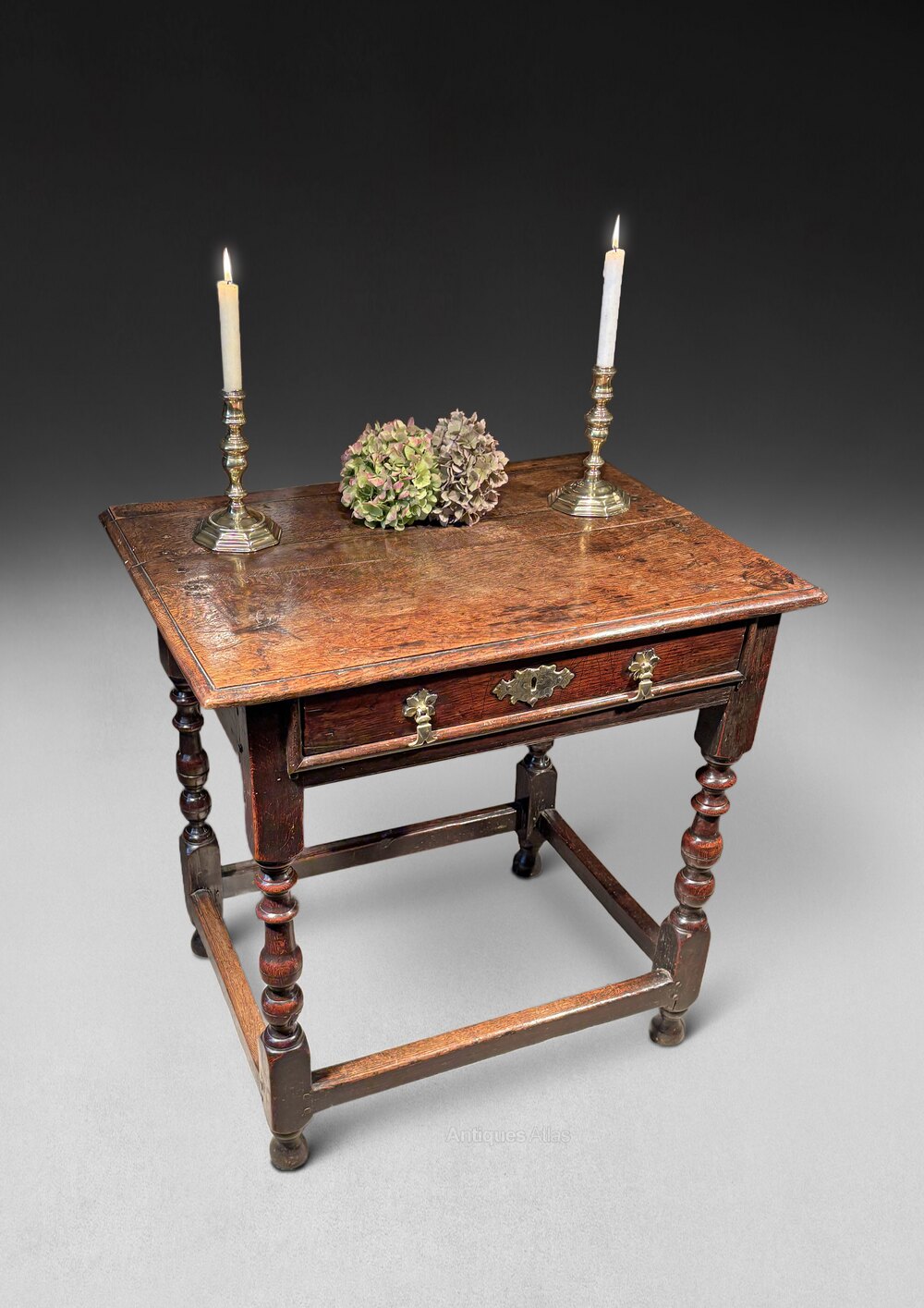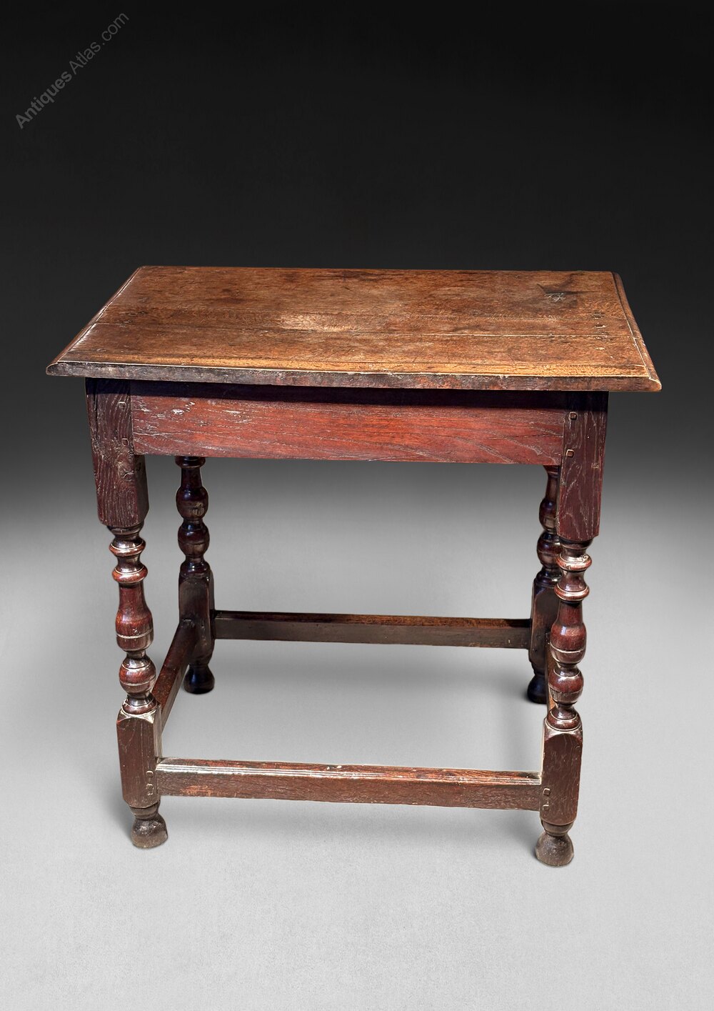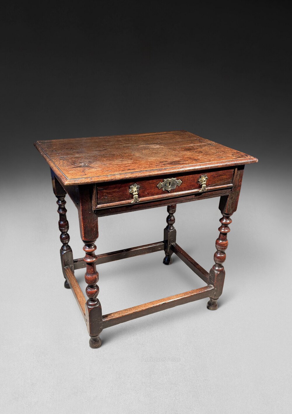 A Queen Anne Period Oak Side Table of pegged construction, the plank top with a moulded edge above a frieze drawer and on baluster turned legs united by stretchers. This table retains the original handles and escutcheon.