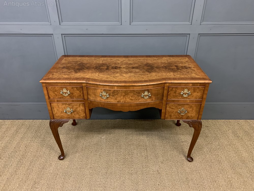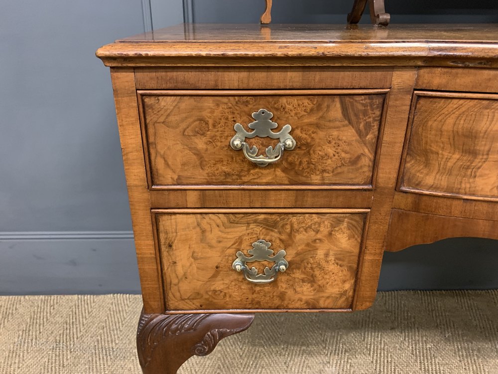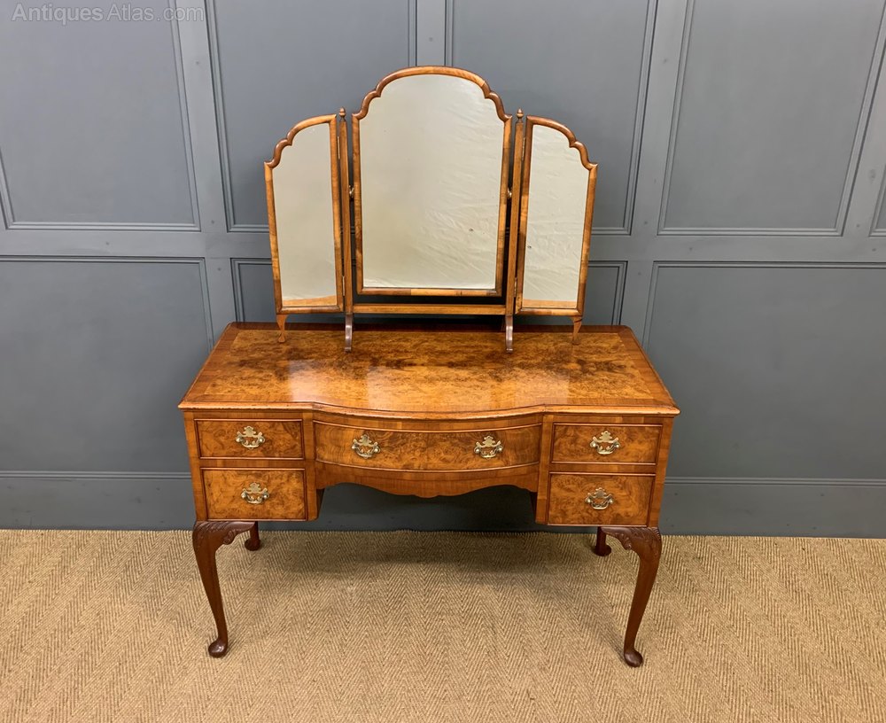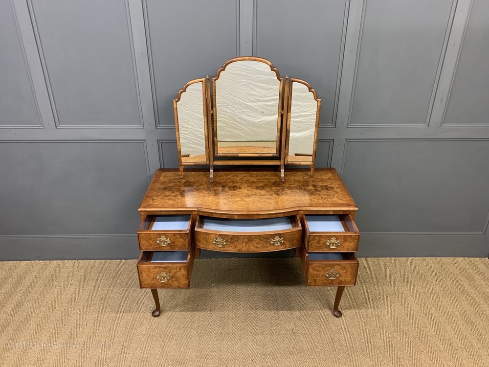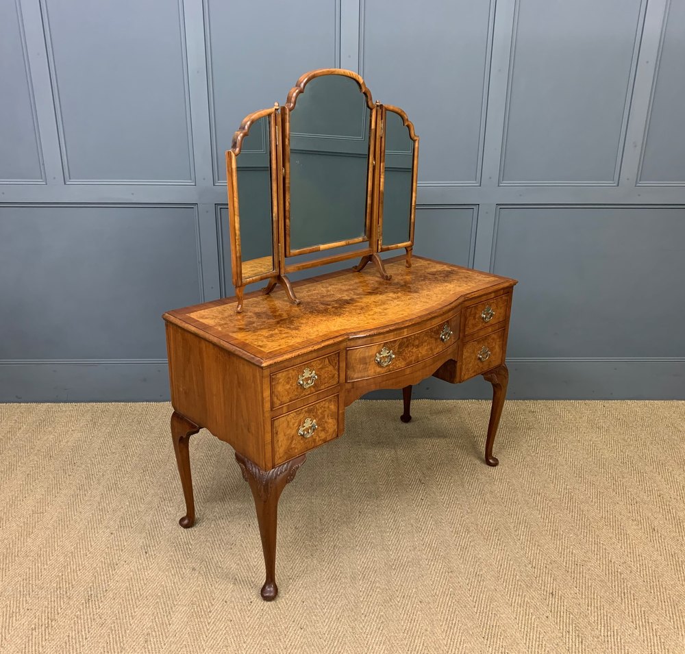 A lovely burr walnut dressing table in the Queen Anne style. Well made in solid walnut with attractive burr walnut veneers onto a solid oak carcas. The tryptich mirror is adjustable and detachable, The side mirrors can be angled in or out and the central mirror up and down. The table itself has an arrangement of 5 drawers, all fitted with their original brass handles. The table top is finished with cross banding to the edges. All standing on elegant cabriole legs in solid walnut. We have had this lovely table sympathetically repolished to a a very high standard. It is now offered for sale in excellent condition with a great colour and patina.