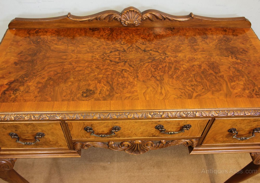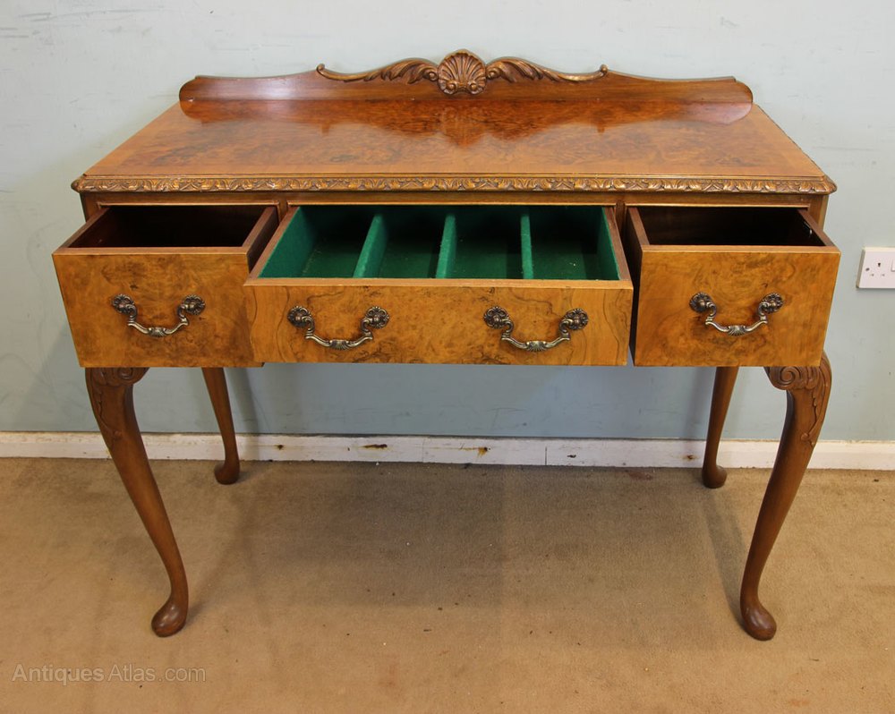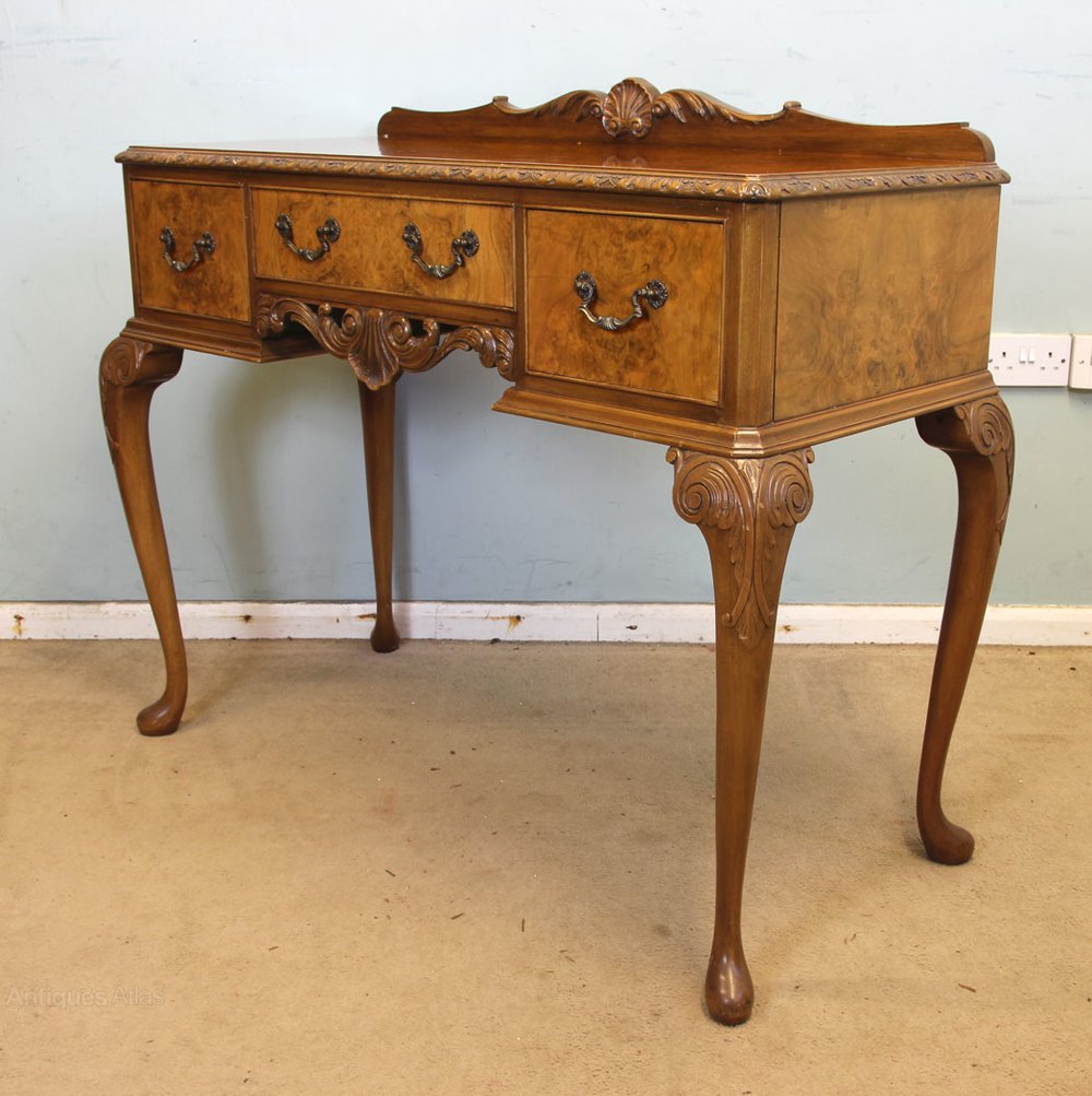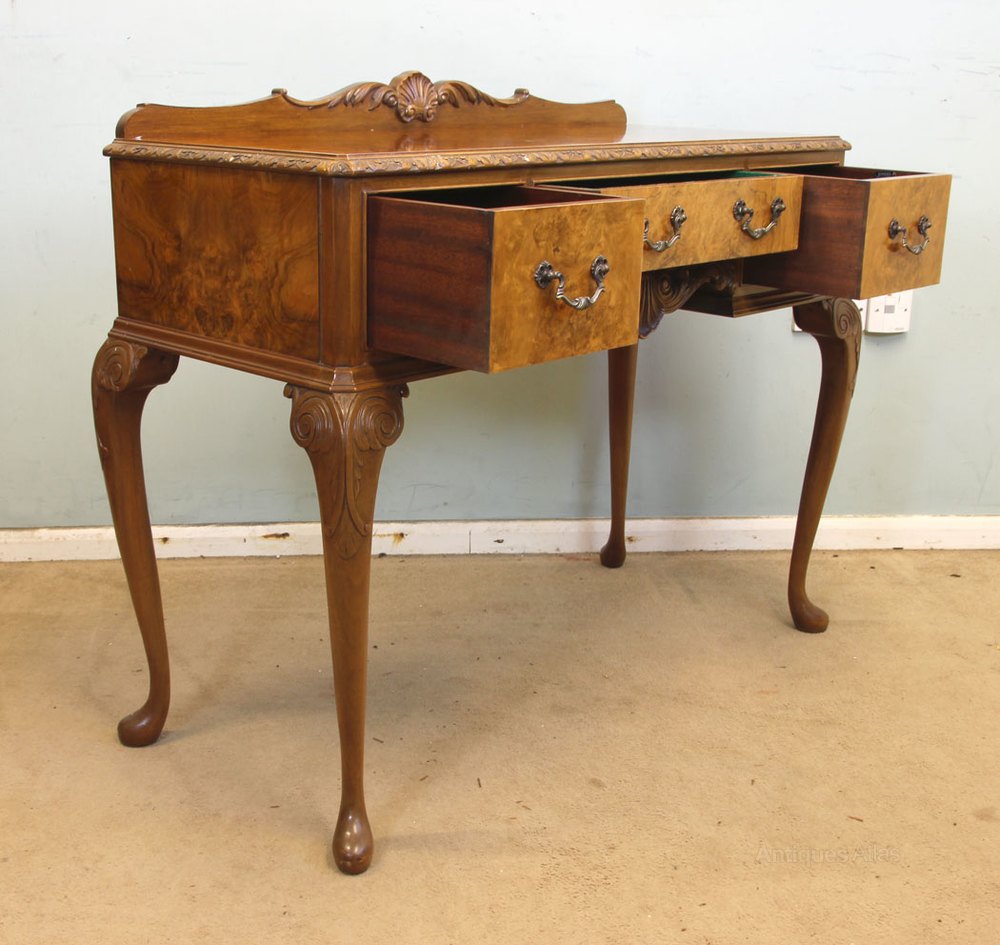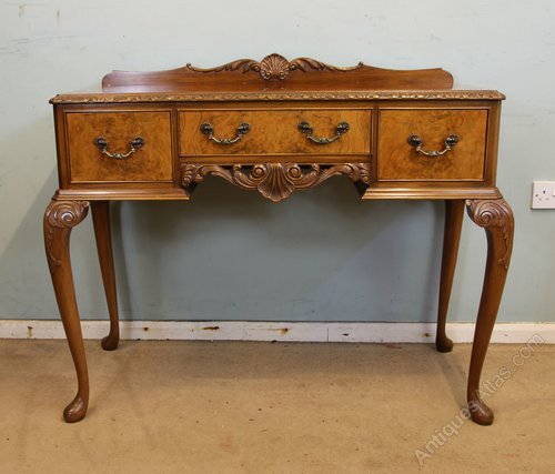 Antique Queen Anne Style Burr Walnut Side Table. This Queen anne style burr walnut side table / server has a low shaped up stand to the back with carved decoration to the centre. The top having lovely figured walnut with cross banded edge with carved detail to the edge. Having centre drawer fitted with cutlery compartment with carved and scrolled detail under flanked either side by deeper drawer all the drawers have lovely figured walnut drawer fronts and all fitted with brass handles. All supported by Queen Anne style legs with carved detail. The sides of the table finished in figured walnut.