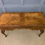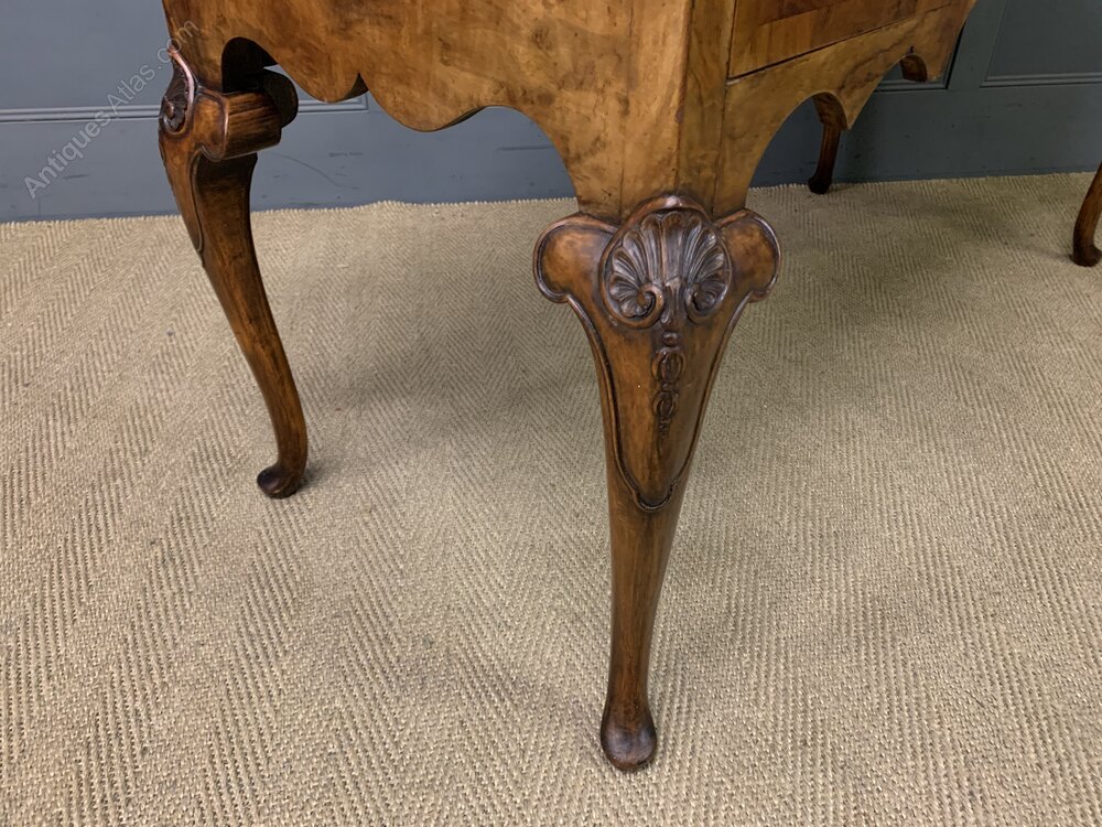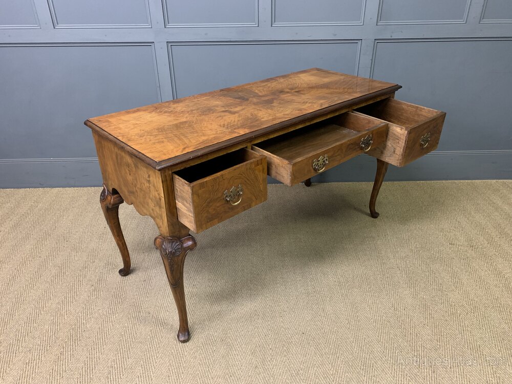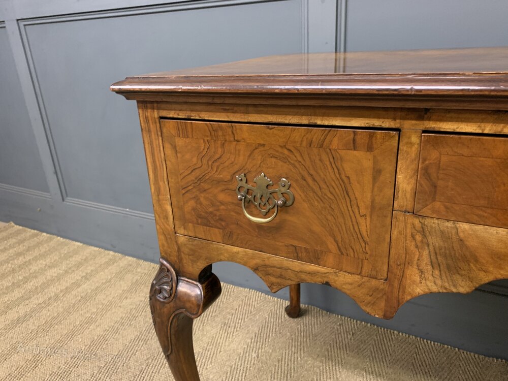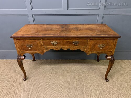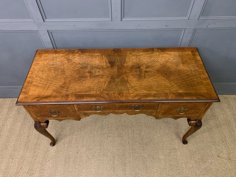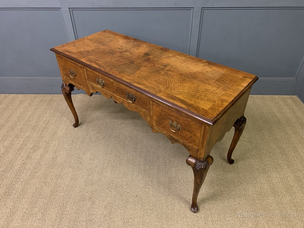 A good queen Anne style burr walnut side, or console, table. Well constructed in solid walnut with attractive burr walnut veneers. Of a good length and would serve well within a number of different room scenarios within the modern home, ie living room/dining room/hallway. With an arrangement of 3 drawers all fitted with their original solid brass handles. The table top and the drawer fronts are all cross banded. Standing on elegant cabriole legs with carved shell motiffs to the knees and terminating in pad feet. Cleaned and waxed in our workshops and now offered for sale in very good condition, ready to go straight into the home.