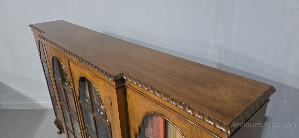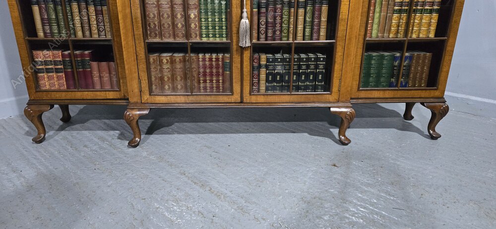 A very nice quality Queen Anne style four door walnut breakfront library bookcase, nine adjustable solid walnut shelves, standing on squat cabriole legs, all working locks with keys, waxed and cleaned ready to be placed in your home.