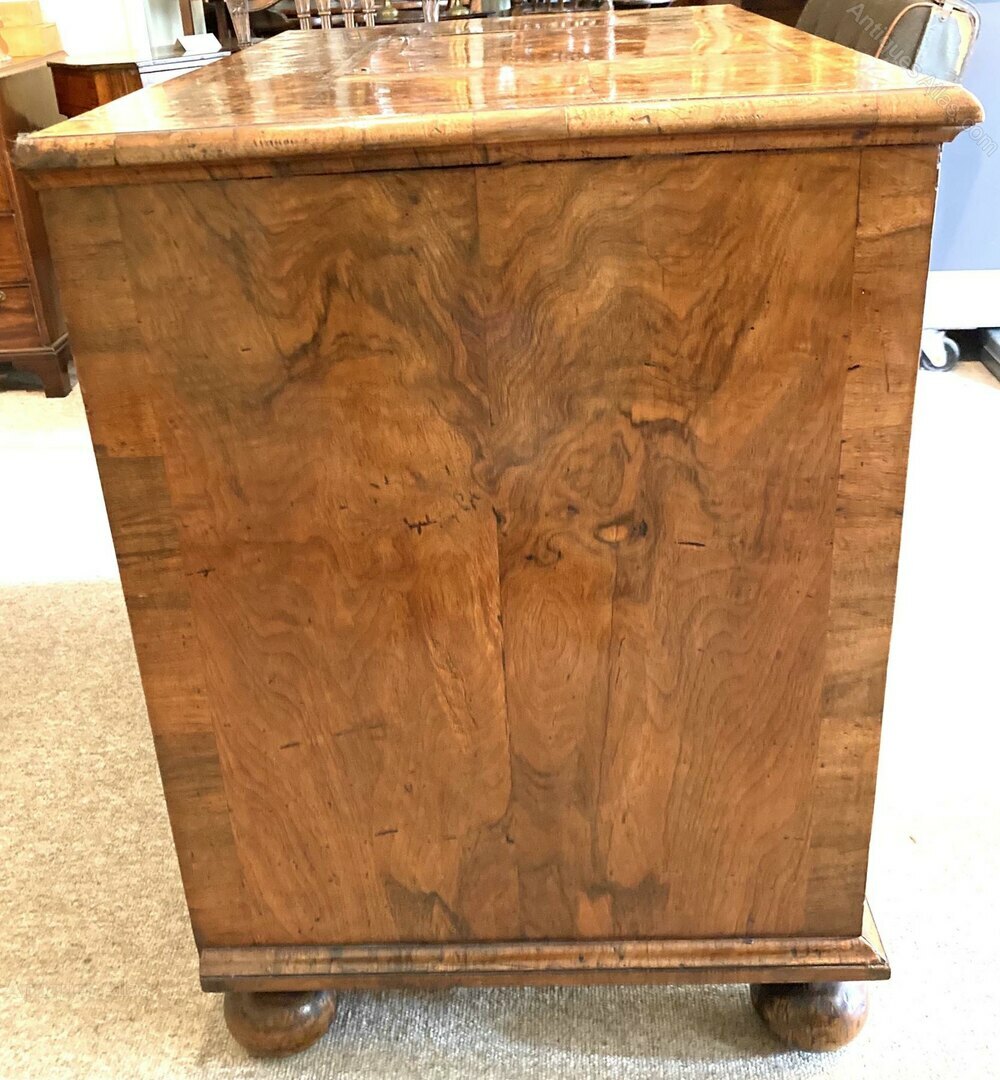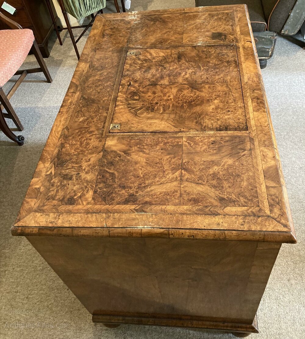 A Rare Queen Anne Walnut Estate or Merchant’s Desk of 12 drawers veneered with matched figured fronts and top, a reading slope, original handles & locks. Later bun feet. Circa 1705
